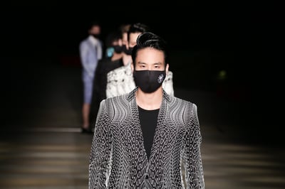 フィナーレでは、モデル全員がマスクを着用して登場。ウィズコロナ時代のニューノーマルのスタートとして生まれたというオリジナルキャラクター「MAJI君」をプリントした。