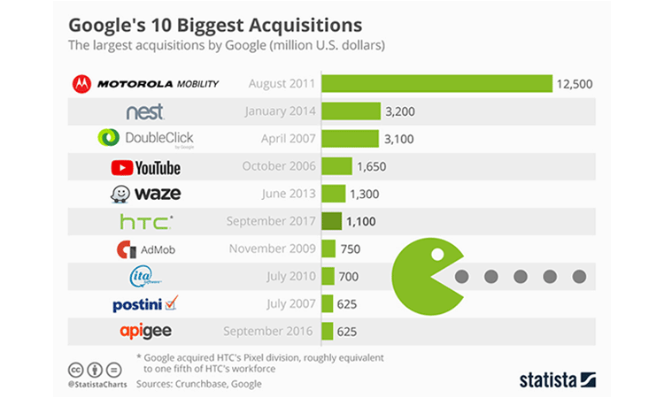 2001年から現在までGoogleが買収した企業数は240以上にものぼる。