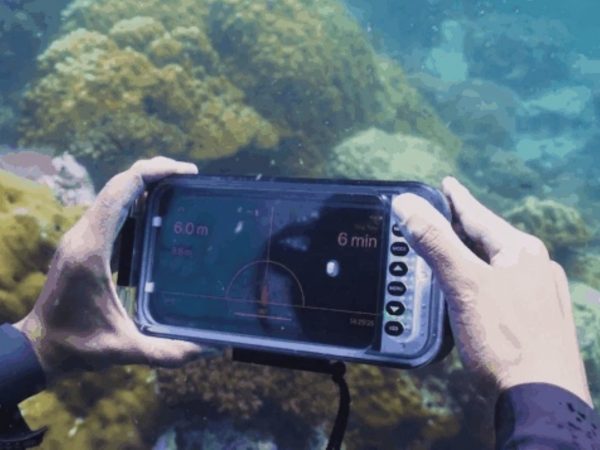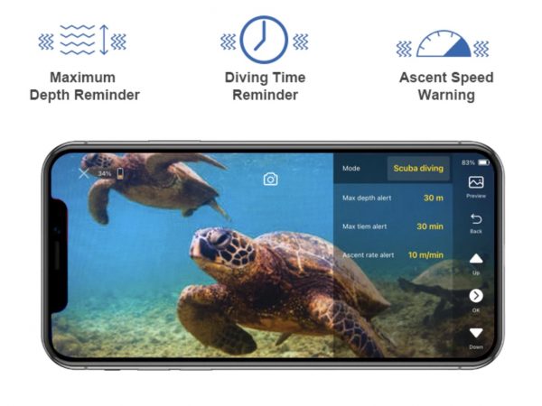 そうしたデータをチェックしたり、何分安全停止をしなければならないかを計算したりするのがダイブコンピューターだが、この機能をHotDiveは搭載する。スマホスクリーンに深度などが表示され、また安全停止のポイントまで浮上したらバイブレーションなどでユーザーに警告する。