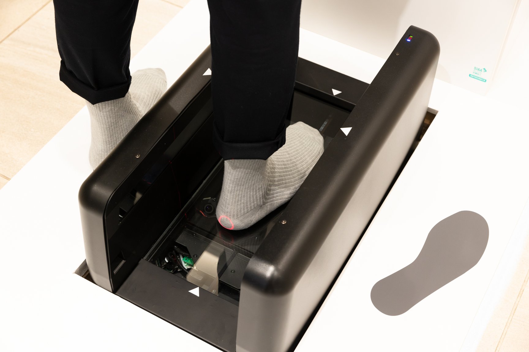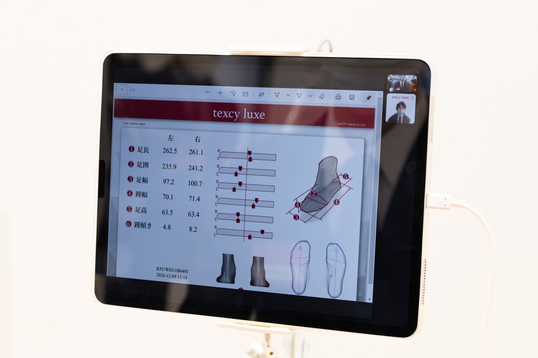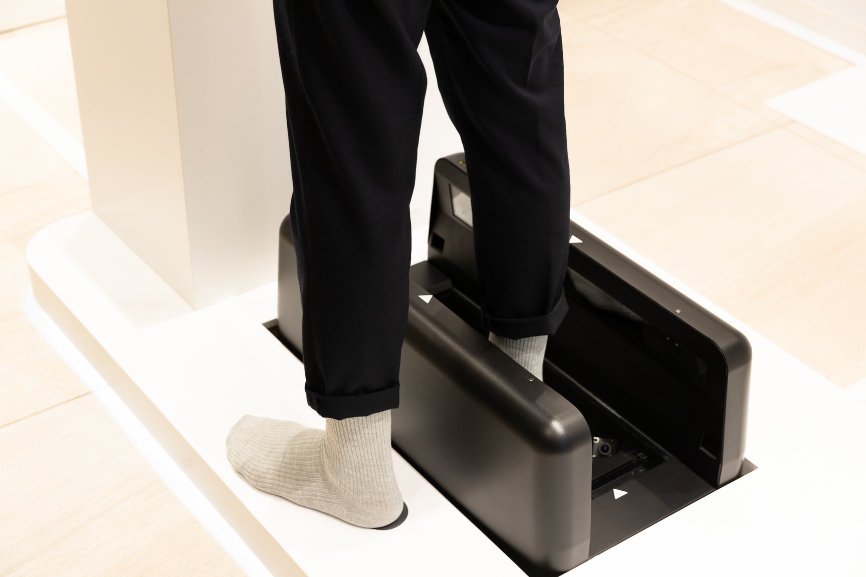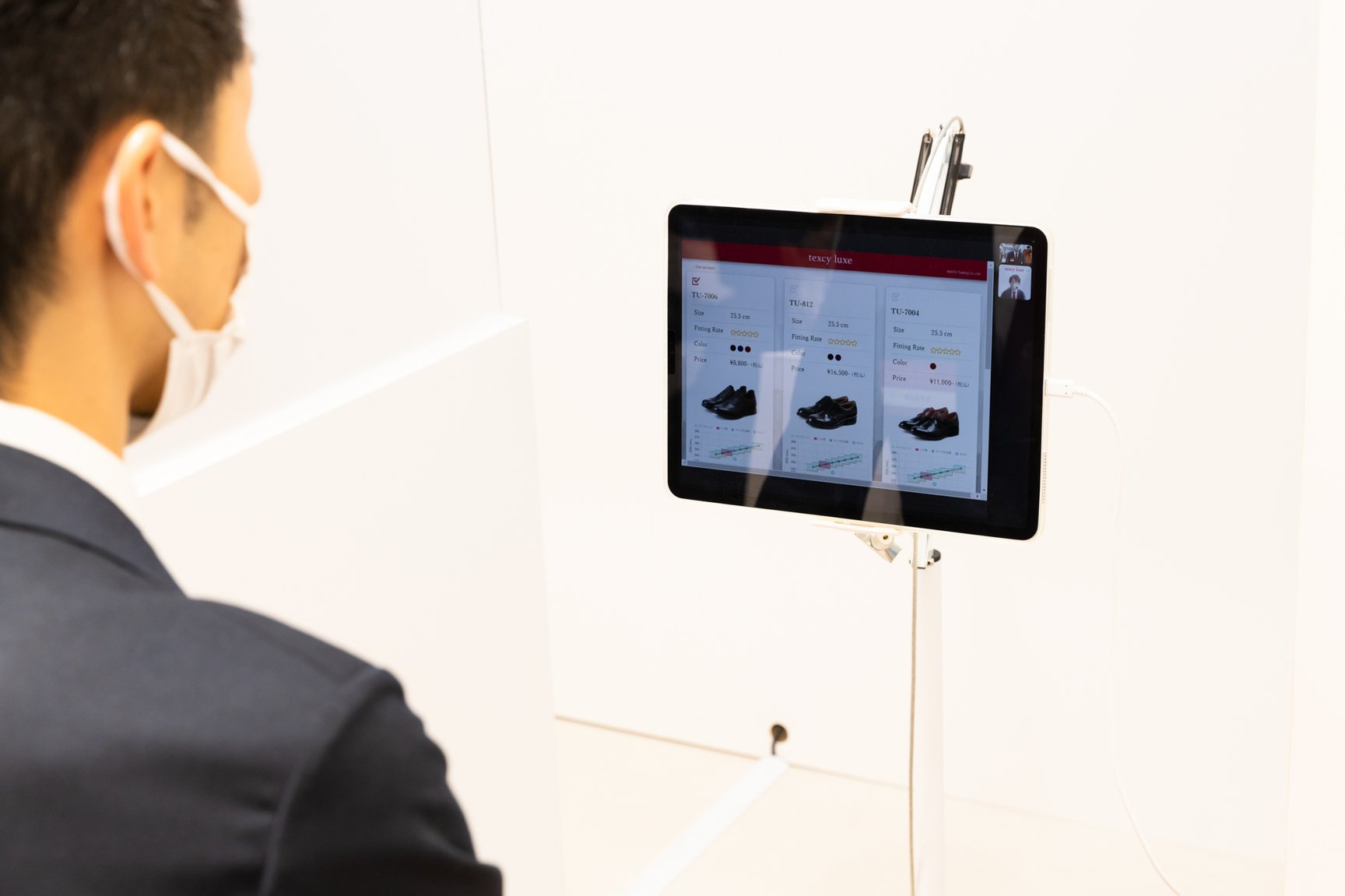 入店時には非接触型体温計と消毒液噴霧器で検温、消毒を行い、「エアタッチパネル」と「INFOOT2」を連動させた3D計測器で足形を計測。計測時間は3?5分程度で、エアタッチパネルで入力した生まれ年や、計測結果などの情報をもとに壁面に展示しているシューズから推奨商品をライトアップする。試着スペースにはタブレット端末を用意し、「足長?足囲?足幅?踵幅?足高?踵傾き」の計6項目の計測結果とライトアップしたシューズを含めた約6つの推奨商品の情報を表示するほか、遠隔でリモート接客を実施。展示棚やタブレット端末にあるQRコードを読み込むとオンラインサイトにアクセスでき、オンライン決済から4営業日までに指定場所へ商品が配送される。