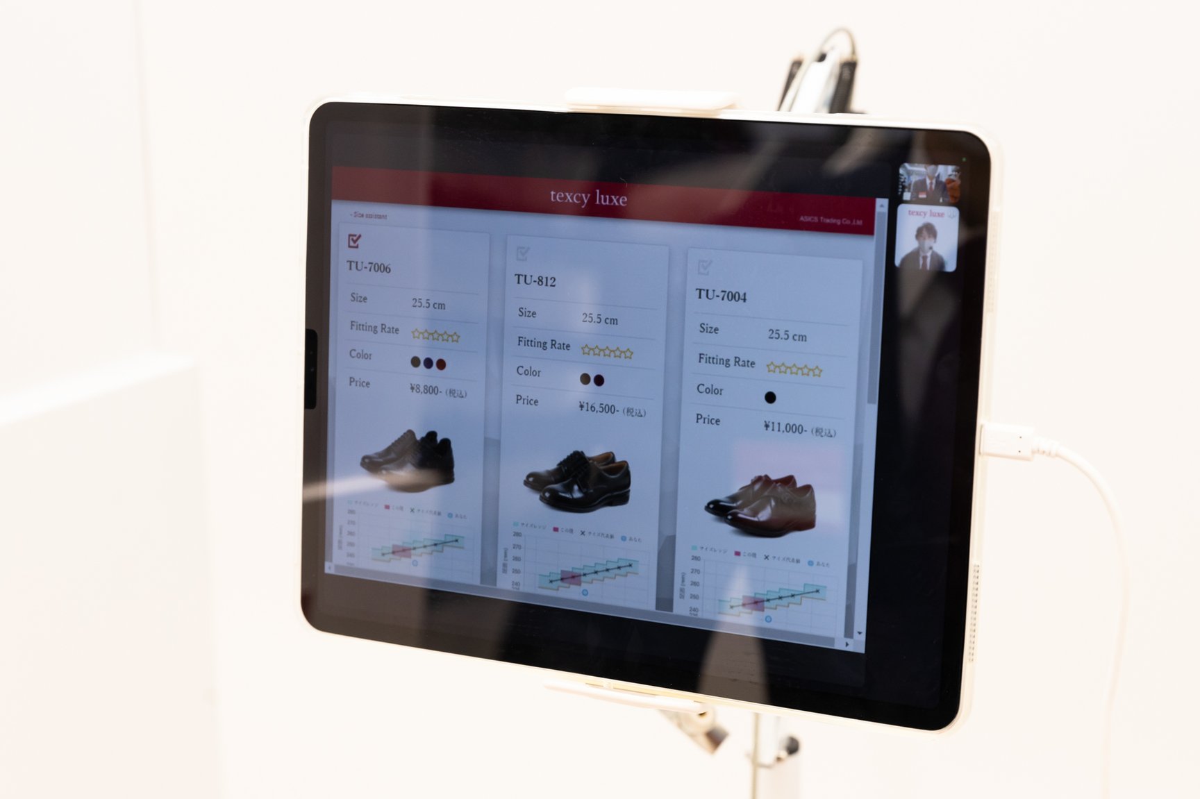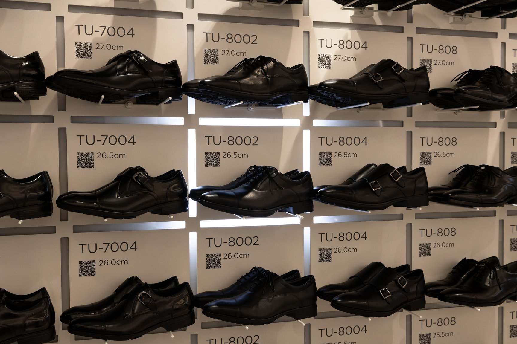 展示シューズはビジネスシューズブランド「テクシーリュクス(texcy Luxe)」の商品を揃え、「ジャパンメイドシリーズ」のTU-812(1万5000円)、「ゴアテックスシリーズ」のTU-802(1万5000円)、「アブソリュートバリューズシリーズ」のTU-7004(1万円)、「フレキシブルドレス」のTU-7010(8000円)、4Eシリーズ(8000円)、「フレキシブルアーバン」のTU-7020(8000円)、「ハイブリッドドレス」のTU-7006(8000円/すべて税別)の計11型のブラックカラーを24.5?28cmの6サイズで用意。一部商品は29cmサイズとバーガンディやブラウンのカラーを展示する。