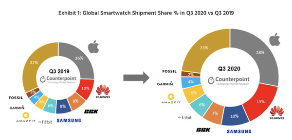 スマートウォッチ世界市場における出荷台数シェア(右が今年第3四半期)