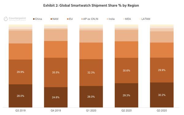カウンターポイントによれば、かつては子ども向けスマートウォッチのシェアが全体の7割以上を占めていた中国で、一般向けスマートウォッチ市場にも勢いが出てきたという。こうした要因もあり、世界市場を長らくけん引してきた北米を逆転している。