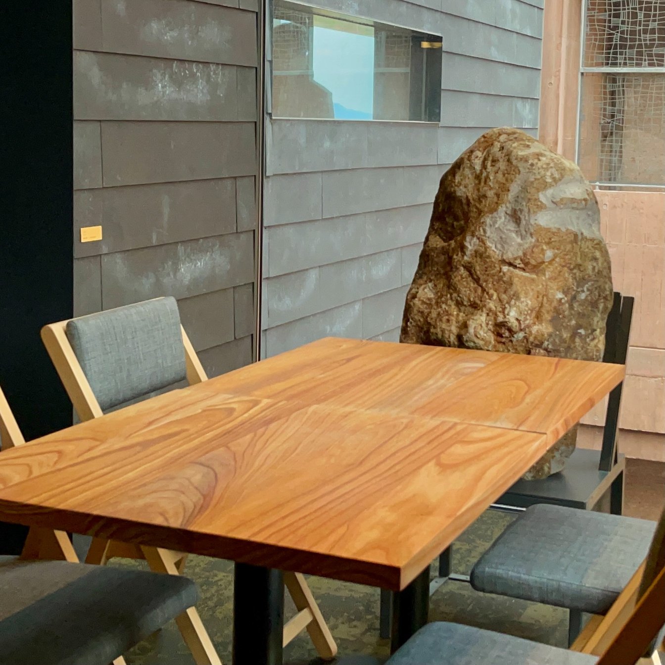 当然、レストランにもアート作品がある。素材の魅力を引き立たせるような外装も内装も黒いレストランの壁には勝正光の素描が並び、2階のあるテーブルには島袋道浩が大分の大地が放つエネルギーにインスピレーションを得てつくった作品、岩の「イワオ」がお誕生日席に鎮座している。岩と一緒の食事なんて、まさにここでしたできない一生の思い出になるのではないだろうか。