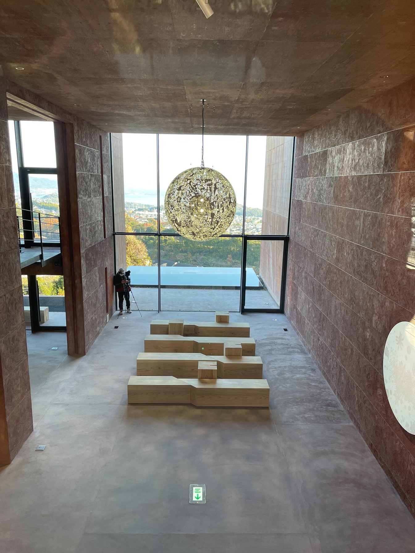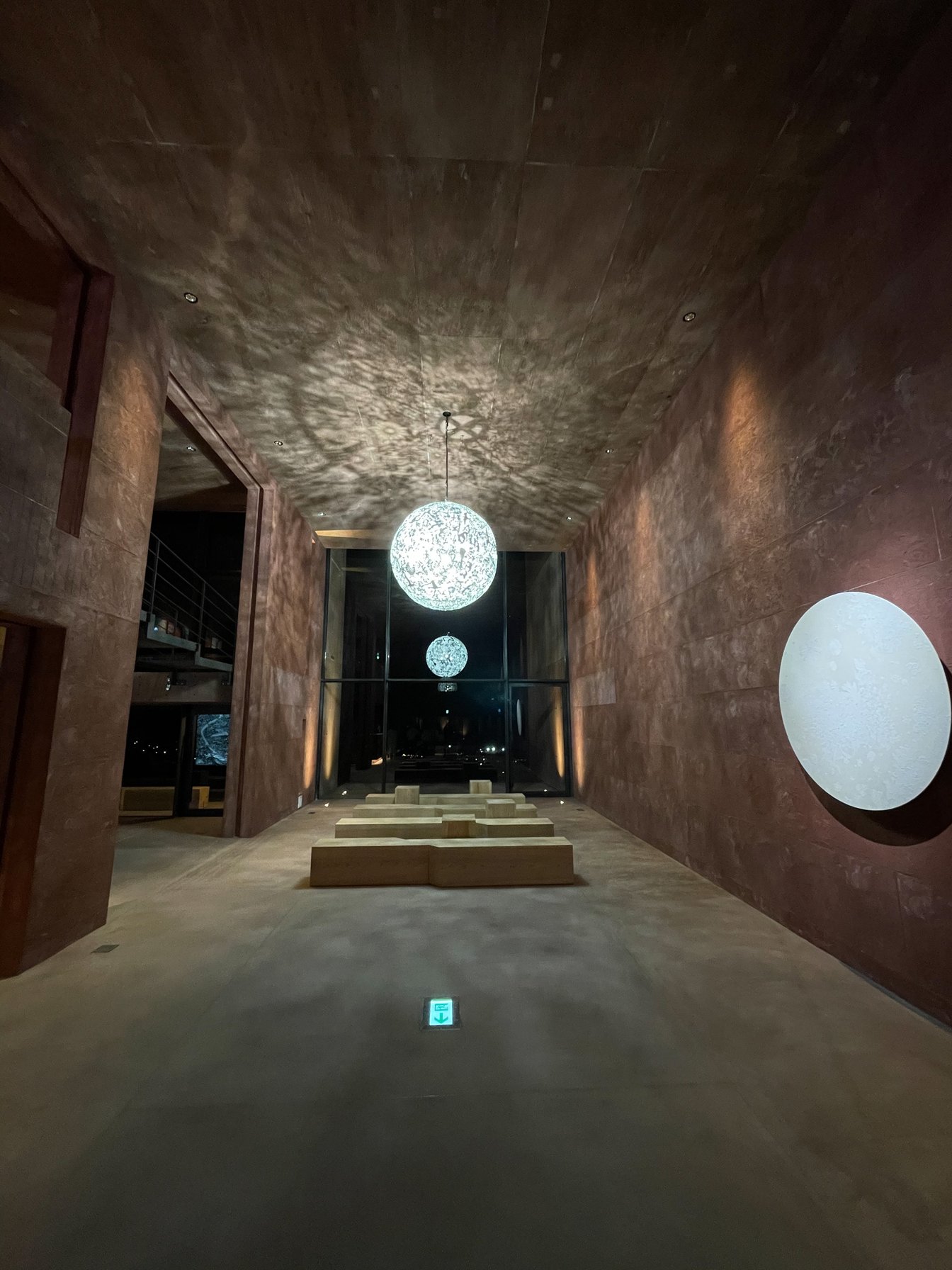 面に開いた穴をくぐると、その向こうからアート作品だったり、広い吹き抜けだったり、エントランスホールが現れ、まるで洞窟巡りのような楽しさがある。別府湾に向けて開かれた開放感あるエントランスホールには大巻伸嗣の巨大作品、Gravity and Grace -ゆだま-が吊るされ、横の壁にはその光を月のように反射するEchoes of Crystalizationが飾られている(ちなみに「ゆだま」は1日に数回光のパフォーマンスを披露する)。