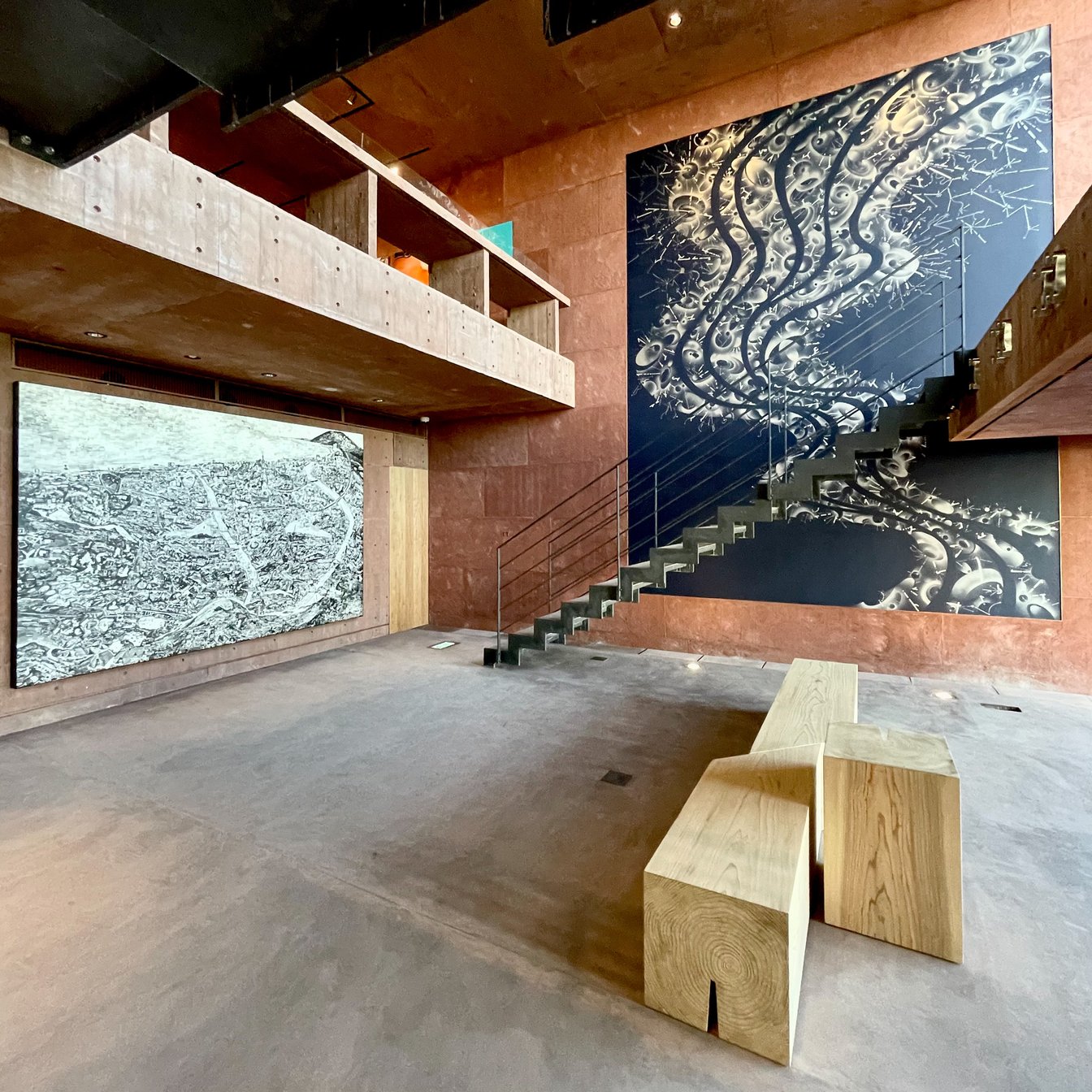 奥に進むと階段が現れ、その脇に別府に立ち登る湯煙のような鈴木ヒラクの「ゆらぎから光へ」という作品。その隣に西野壮平が別府の街中で撮影した2万5000枚の写真をコラージュして作った「別府温泉世界地図」が飾られている。いずれも、このホテルでしか見れないサイトスペシフィックな作品だ。