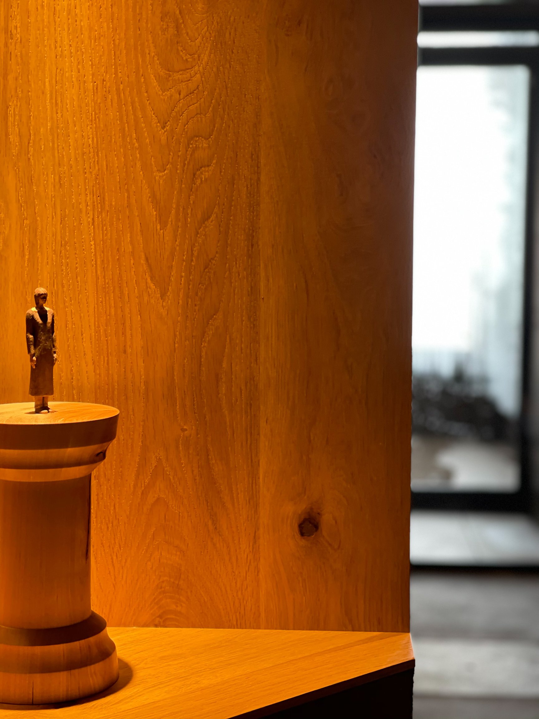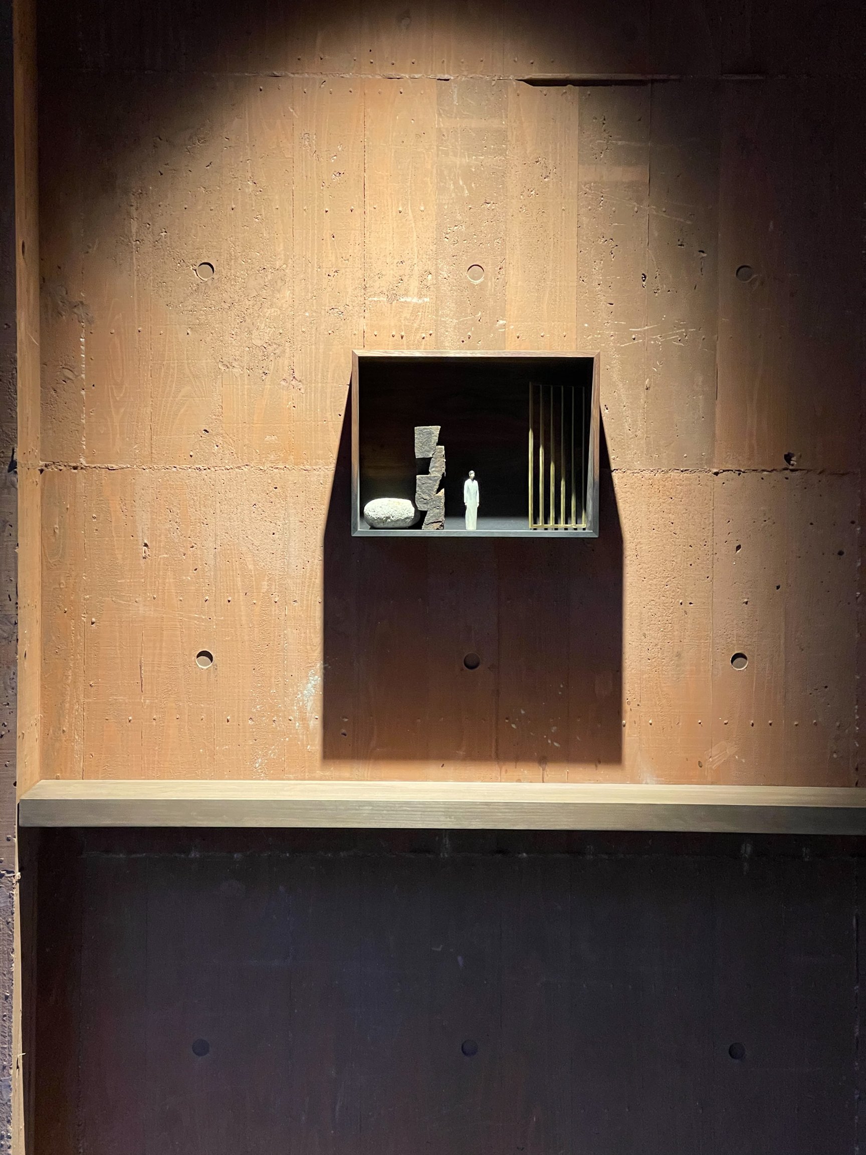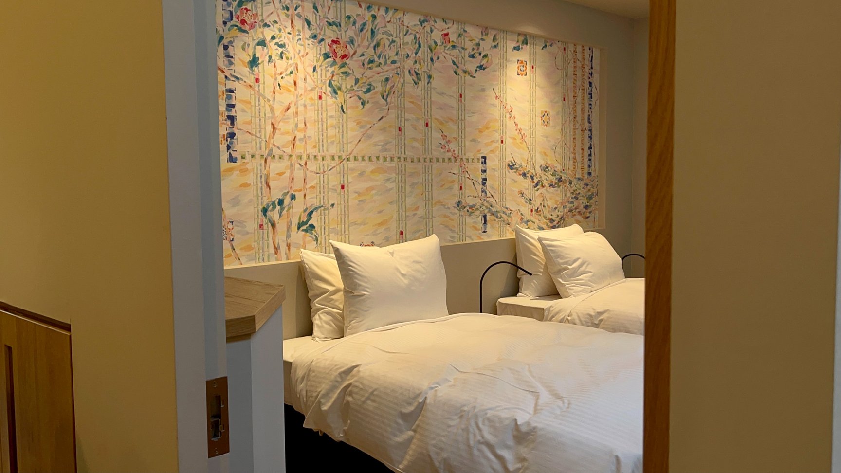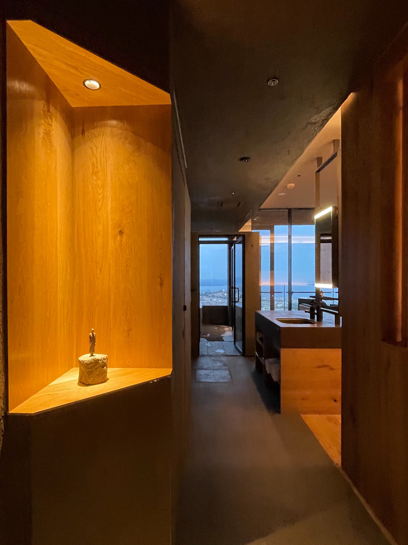 洞窟のようなホテルを巡ると、そこかしこに現れる小さな人の彫刻は大分県竹田市のオレクトロニカの作品。こちらは客室のエントランスも飾っている。客室にはもう1つベッドの上に泉イネの絵も飾られている。一方で、2つだけあるスイートルームには、重ね合わせた写真を彫って作品にする人気作家、Nerholや不確かで広大な宇宙を描いたような目 méの作品が掲げられている。