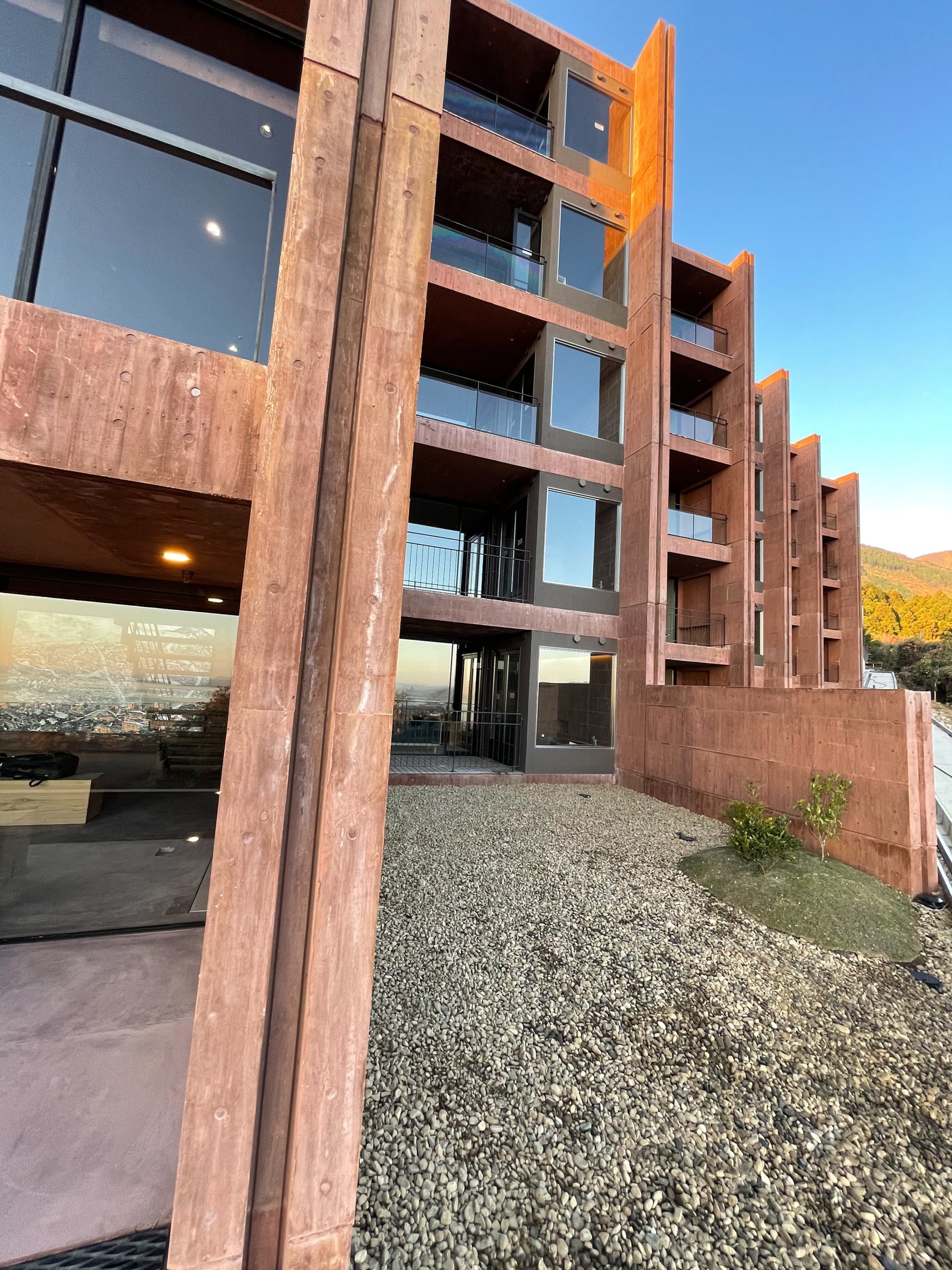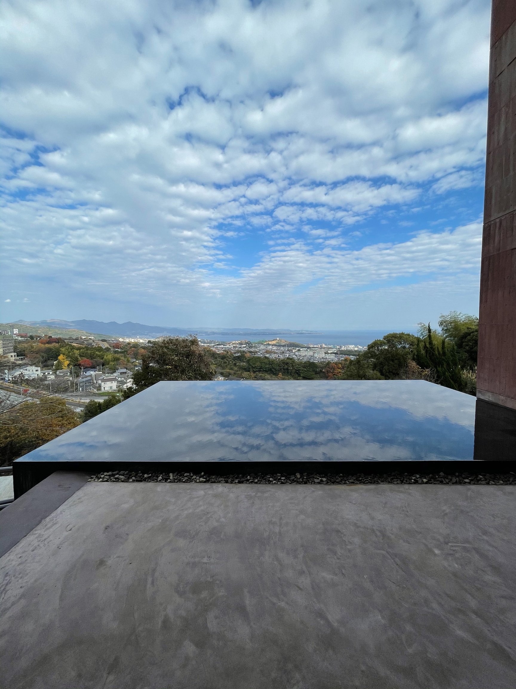 別府の山腹と言えば巨大な杉乃井ホテルがよく知られるが、さらに登った静寂なエリアに不思議な存在感を放つ土色の巨大建造物が出現。建築設計は地元のDABURA.m(ダブラム)社。広大な土地を贅沢に生かした格子状の面で構成された建造物だ。