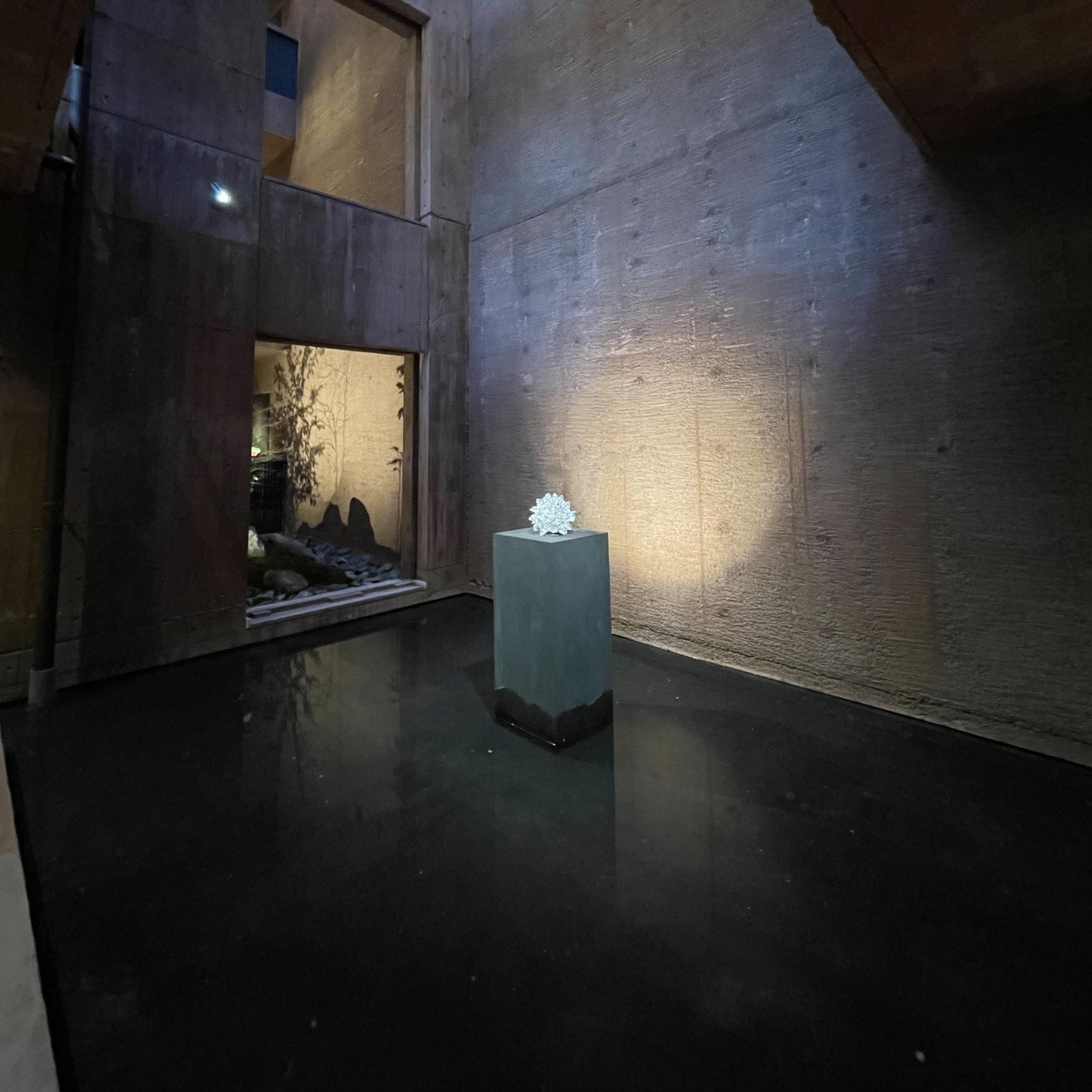 ホテル外には、水の流れがあり、池の中央にはまばゆく輝く青木美家のガラス作品「Vessel of Genetic Code」、そして向かいには中山晃子が別府の鬼石坊主地獄で撮影して作った映像作品「Medium」も展示されている。