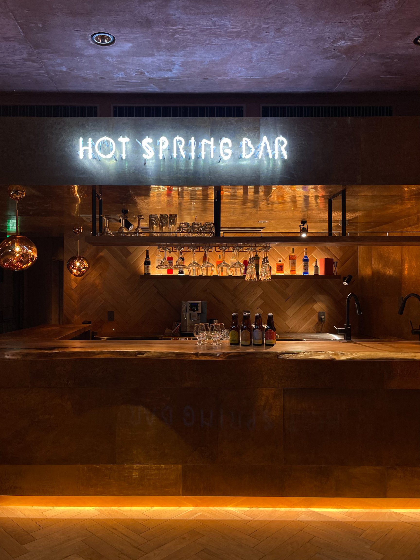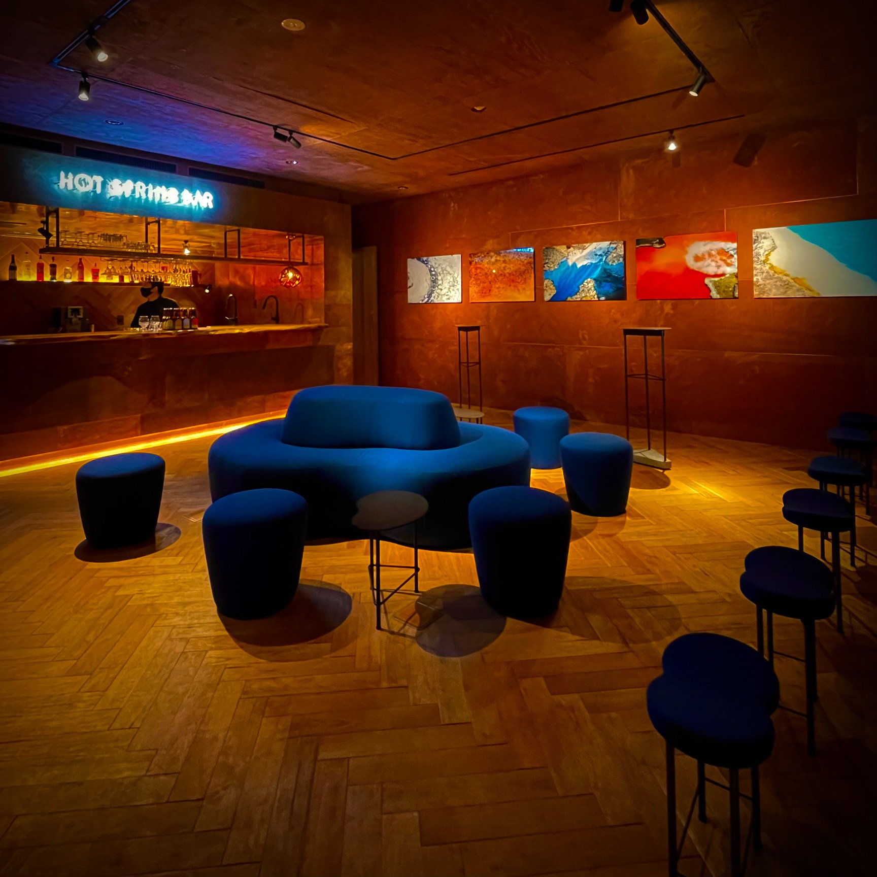 2階には大阪graf社のオリジナルファニチャーが並ぶ洞窟に出現した異空間「HOT SPRING BAR」(HOT SPRINGは「温泉」の意)。オリジナルカクテルや別府湾の景色と一緒に草本利枝の「Another Water」というカラフルな写真作品も楽しむことができる。