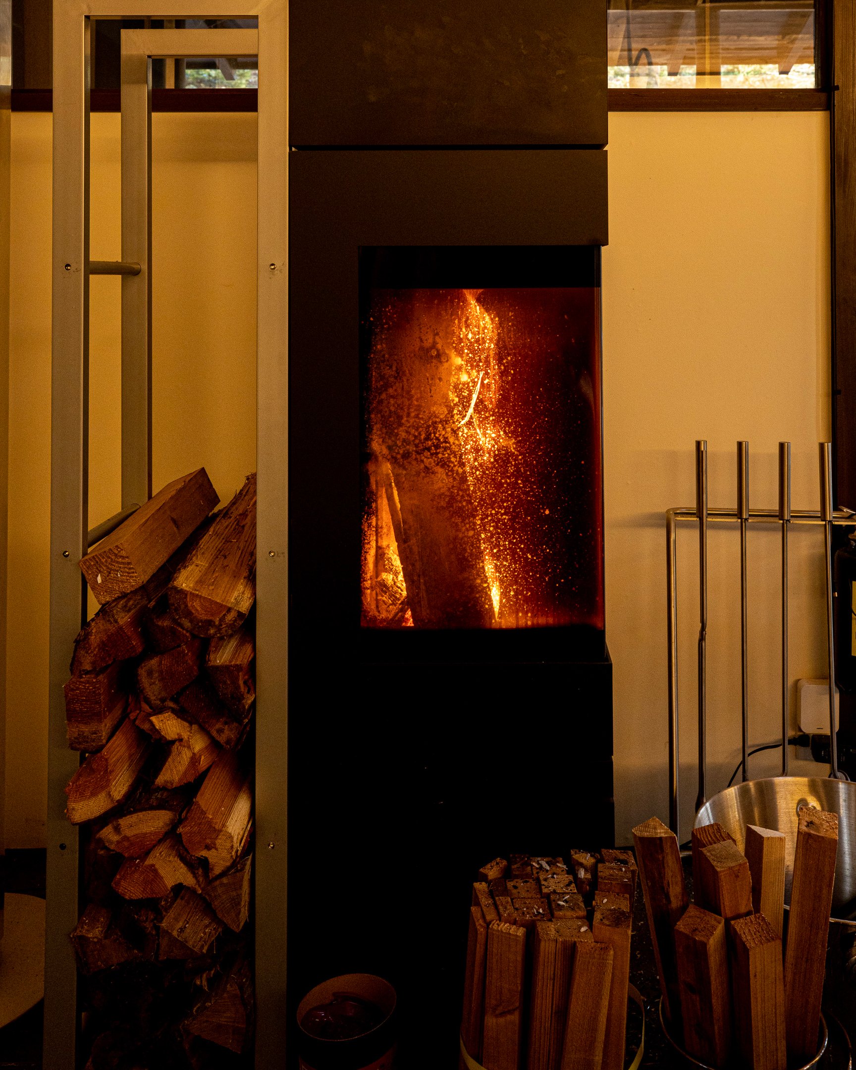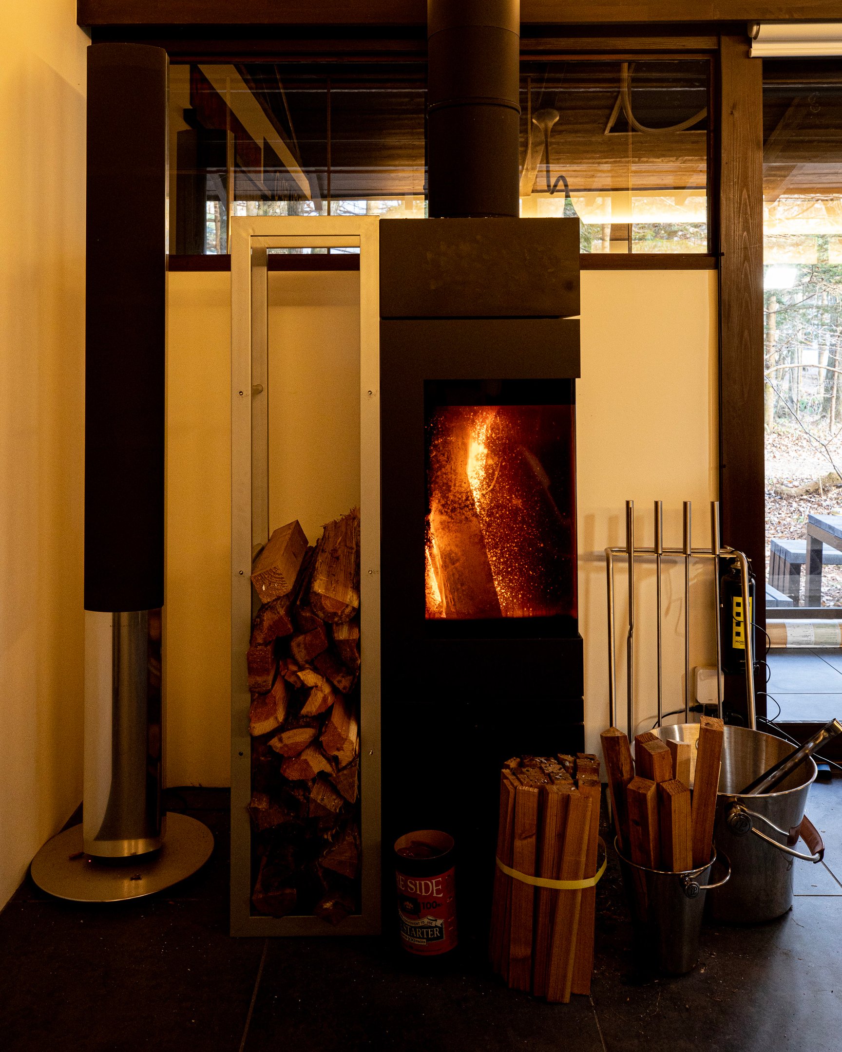 山本:「スキャンサーム」というドイツのメーカーの「エレメンツ」というモデルで、"薪ストーブ界のスマホ"と言われています。燃費効率が非常に良くて、デザインもモダン。薪ストーブってクラシックなデザインのものが多いんですが、この空間にはシンプルなものを設置したいなと思って、こちらを選びました。