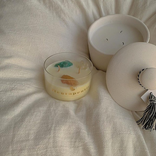 様々なセルフケア製品を提供するfleurapeutic(フルーラピューティック)では、見た目もかわいいアロマキャンドルが販売中。こちらの「クリスタル 天然石 パワーストーン ソイワックスアロマキャンドル」(税抜3200円)は、なんと天然石が埋め込まれているんです。