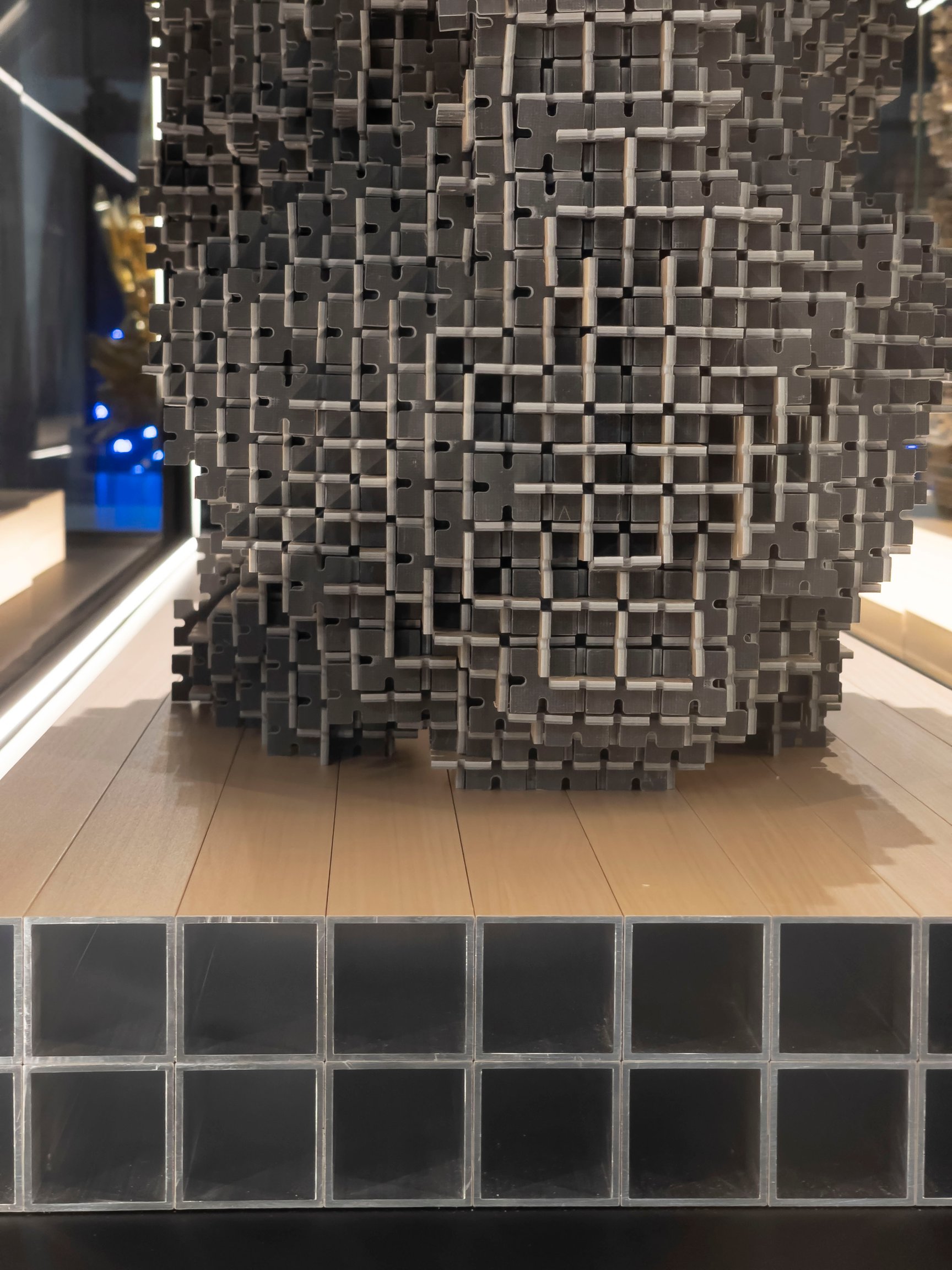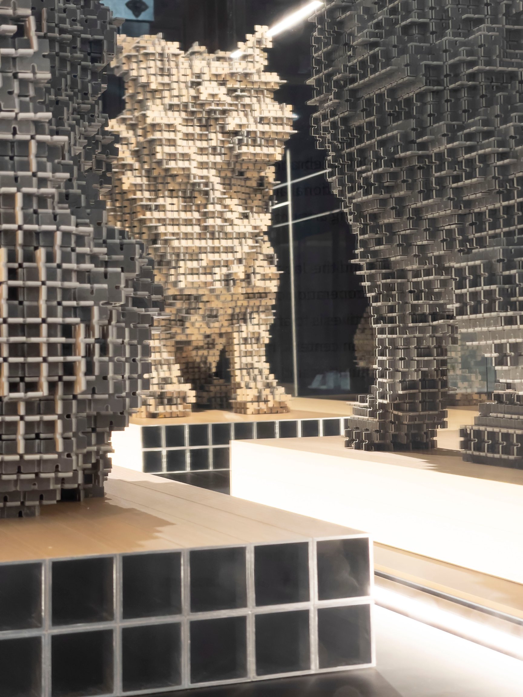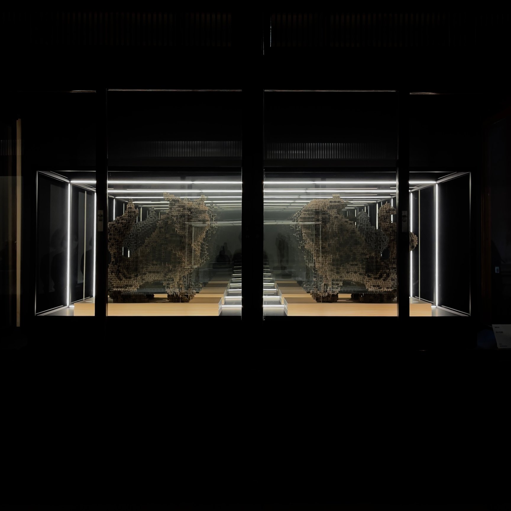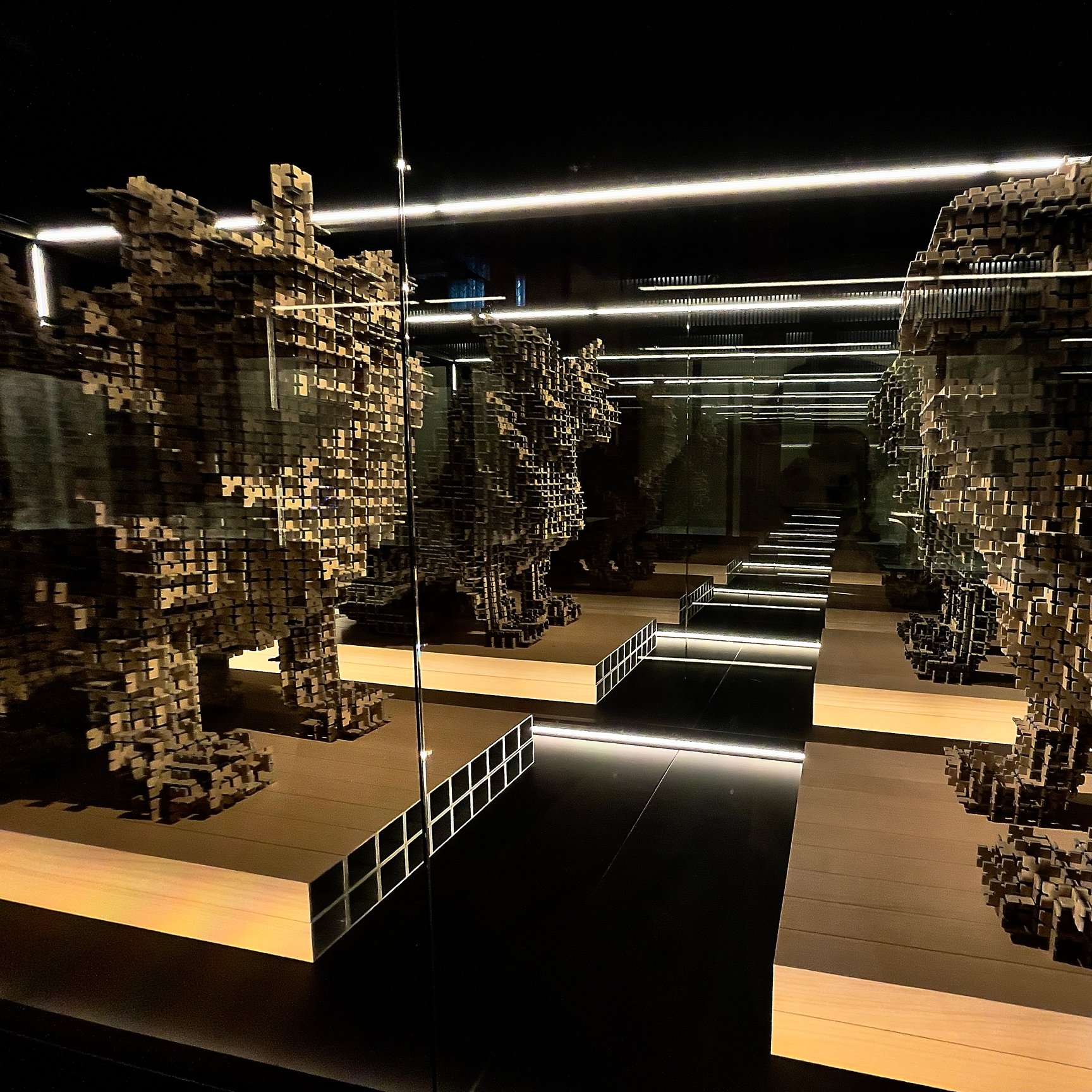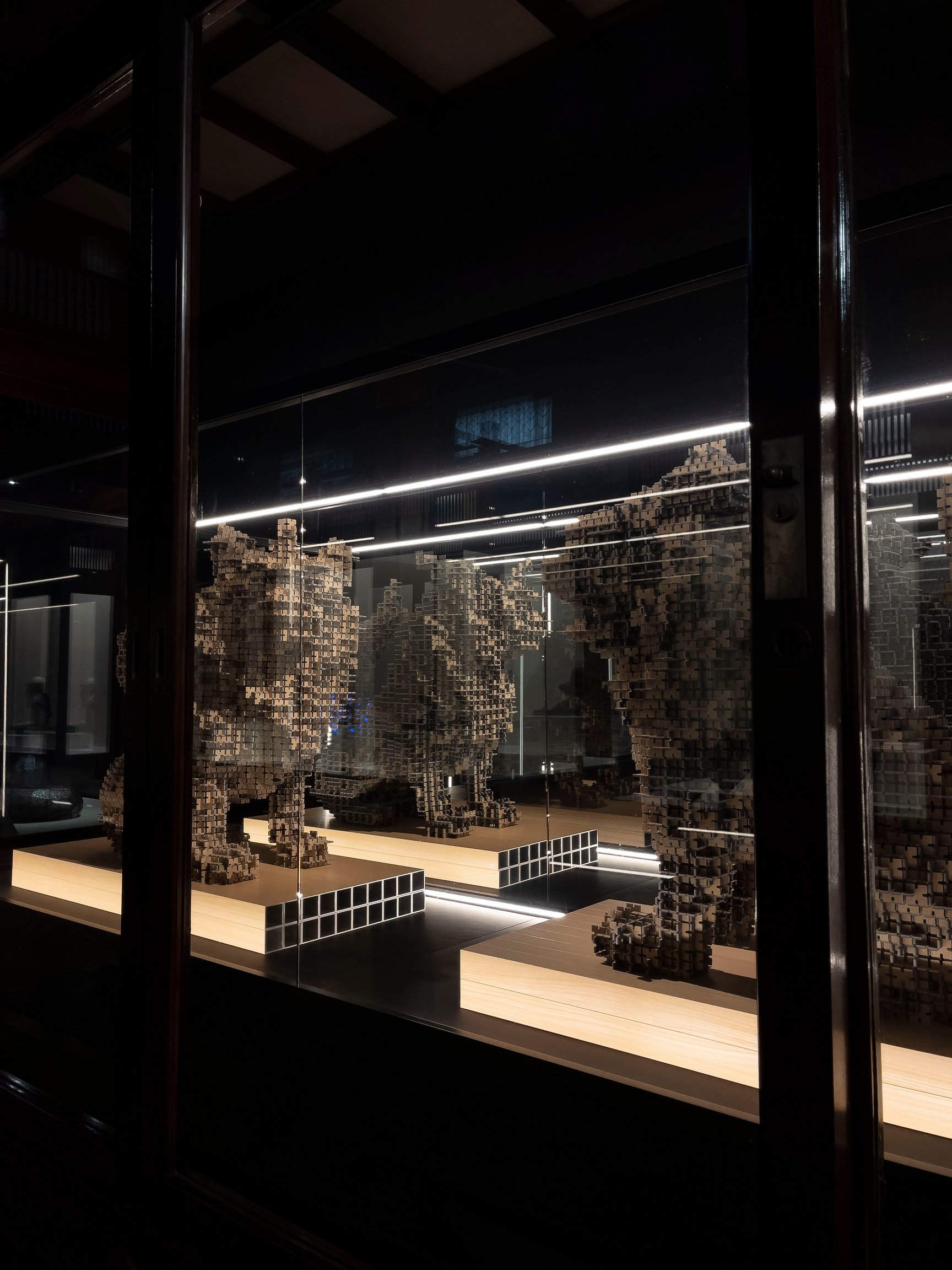 これに宮島達男らの現代を代表する大物アーティストに混じって、堂々の作品を展示していたのが金沢のsecca。伝統工芸と最新の3Dプリンティングの技術を融合した器などを作るクリエイター集団だが、今回は現代社会のそこかしこで使われている本物と見間違える擬木を使った狛犬「A?UN」を、この展覧会のために作り起こし、複製可能なデジタル社会を表した(詳しくはseccaのホームページに解説動画がある)。