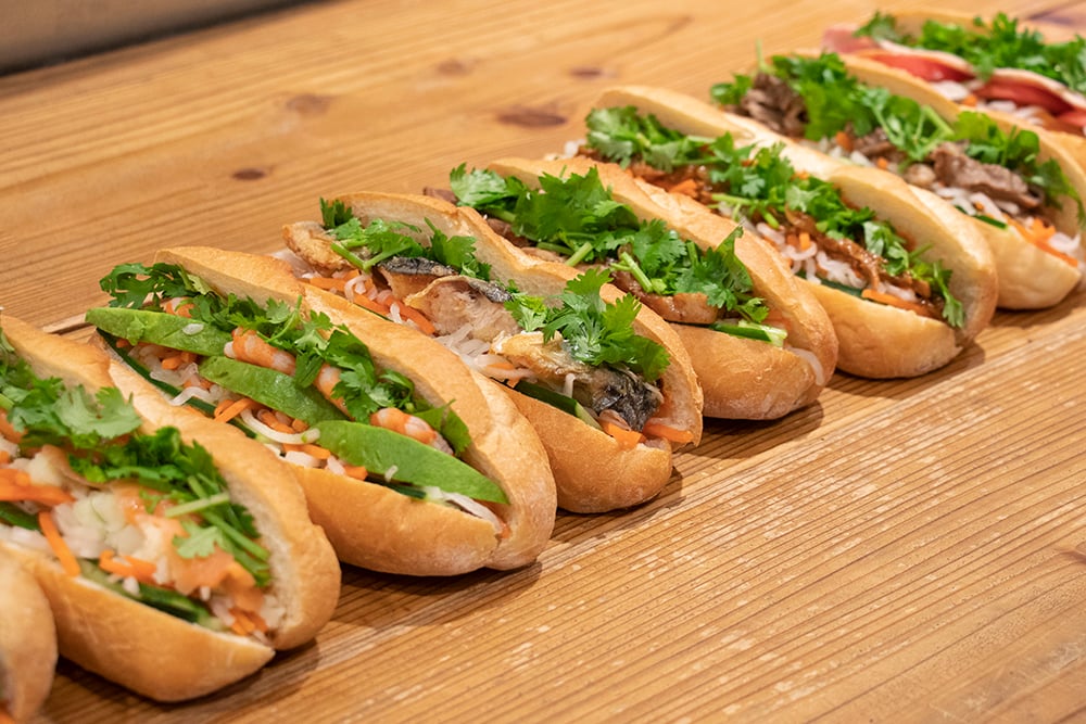 ベトナムサンドイッチ『バインミー』は、柔らかなソフトフランスパンにバター、ナマス、パクチーなどの具材とメインのグリルチキン、牛焼肉、エビアボカドなどをサンド。