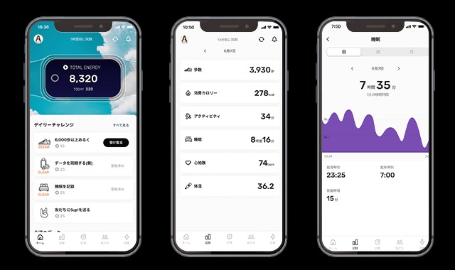 MOTHER Braceletは「歩数?心拍?活動量?体表温?睡眠量」の基本データを常時計測。スマートフォン上のアプリで健康状態をチェックすることができます。