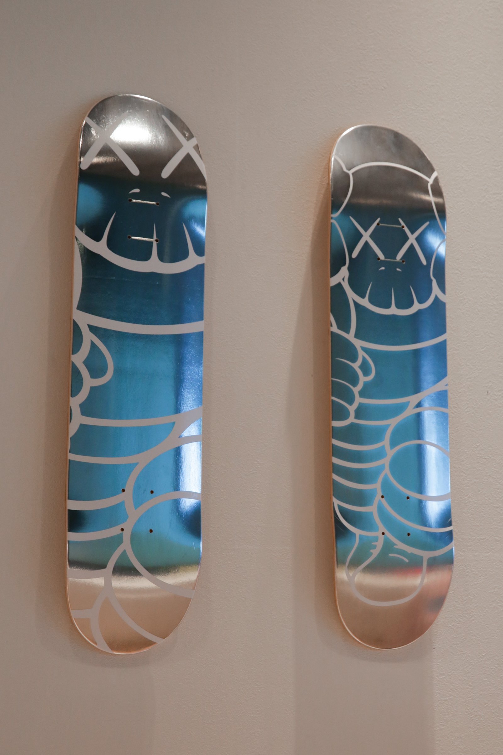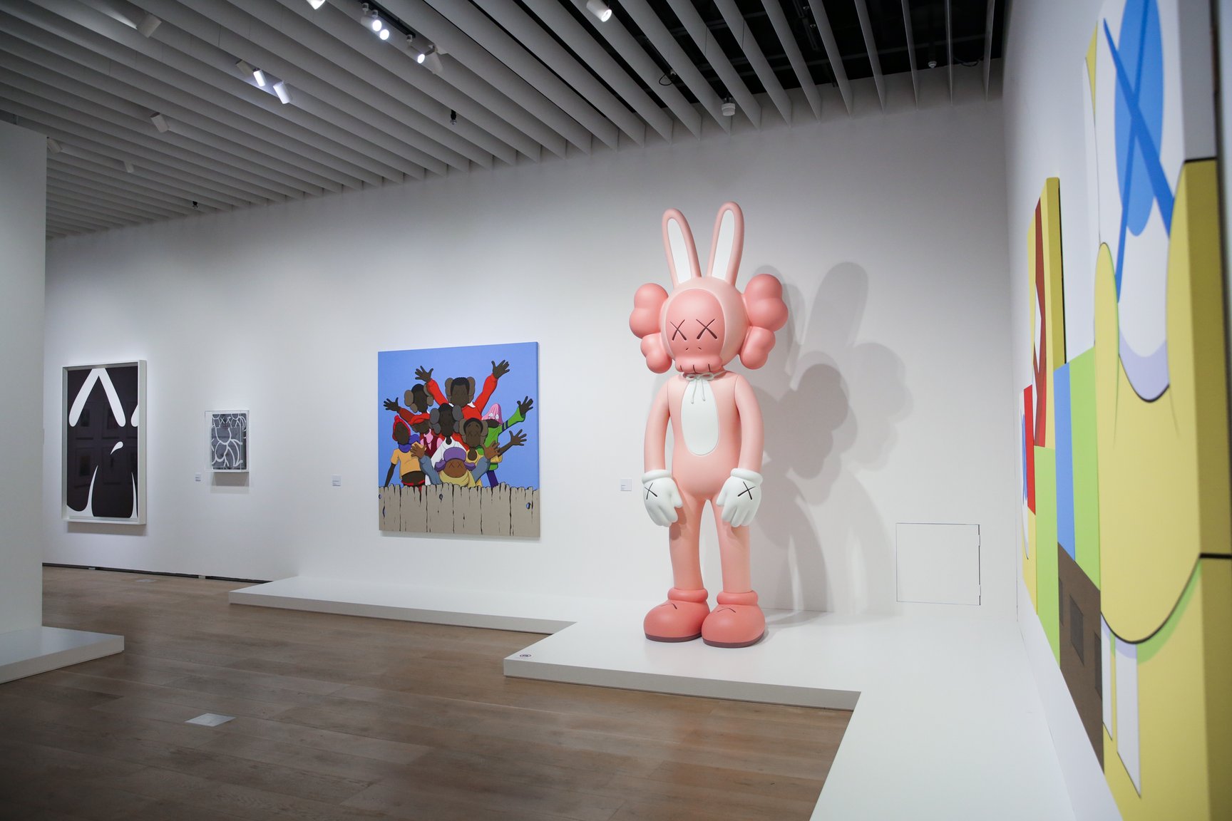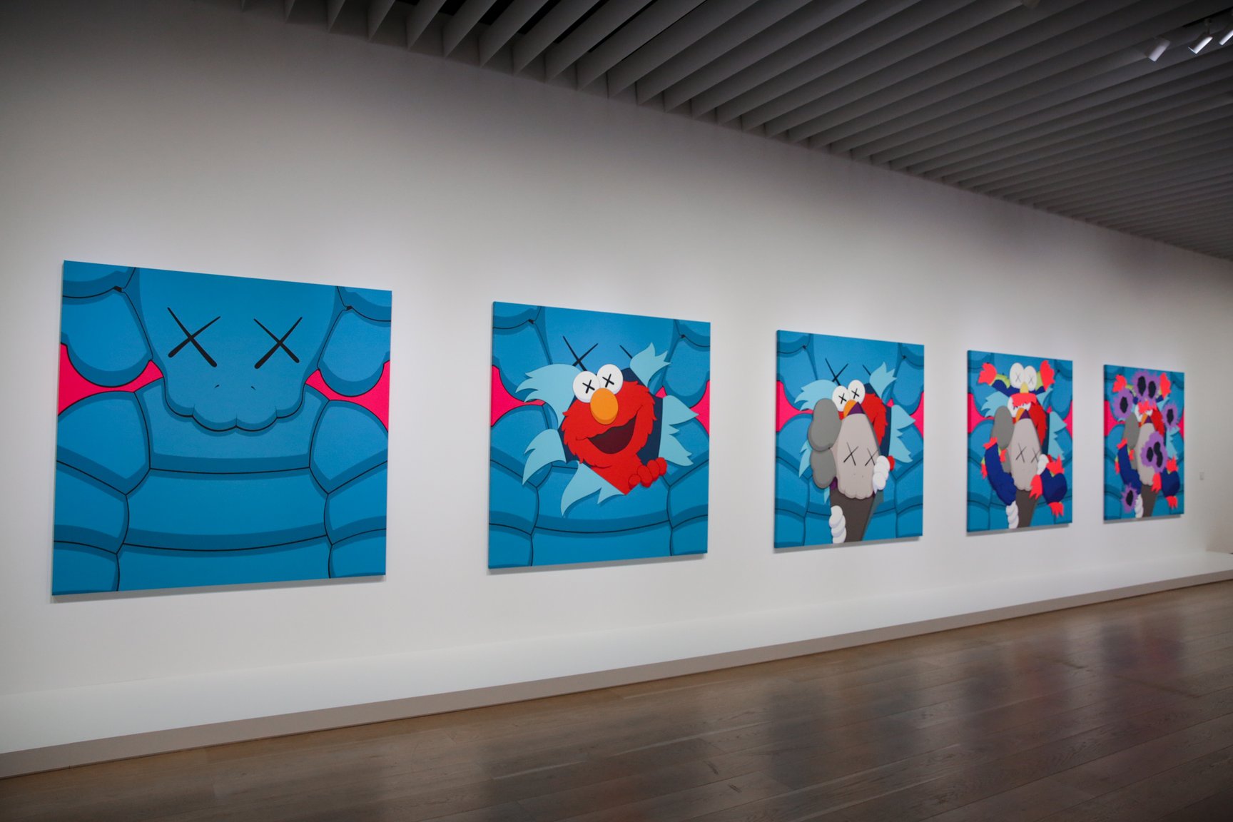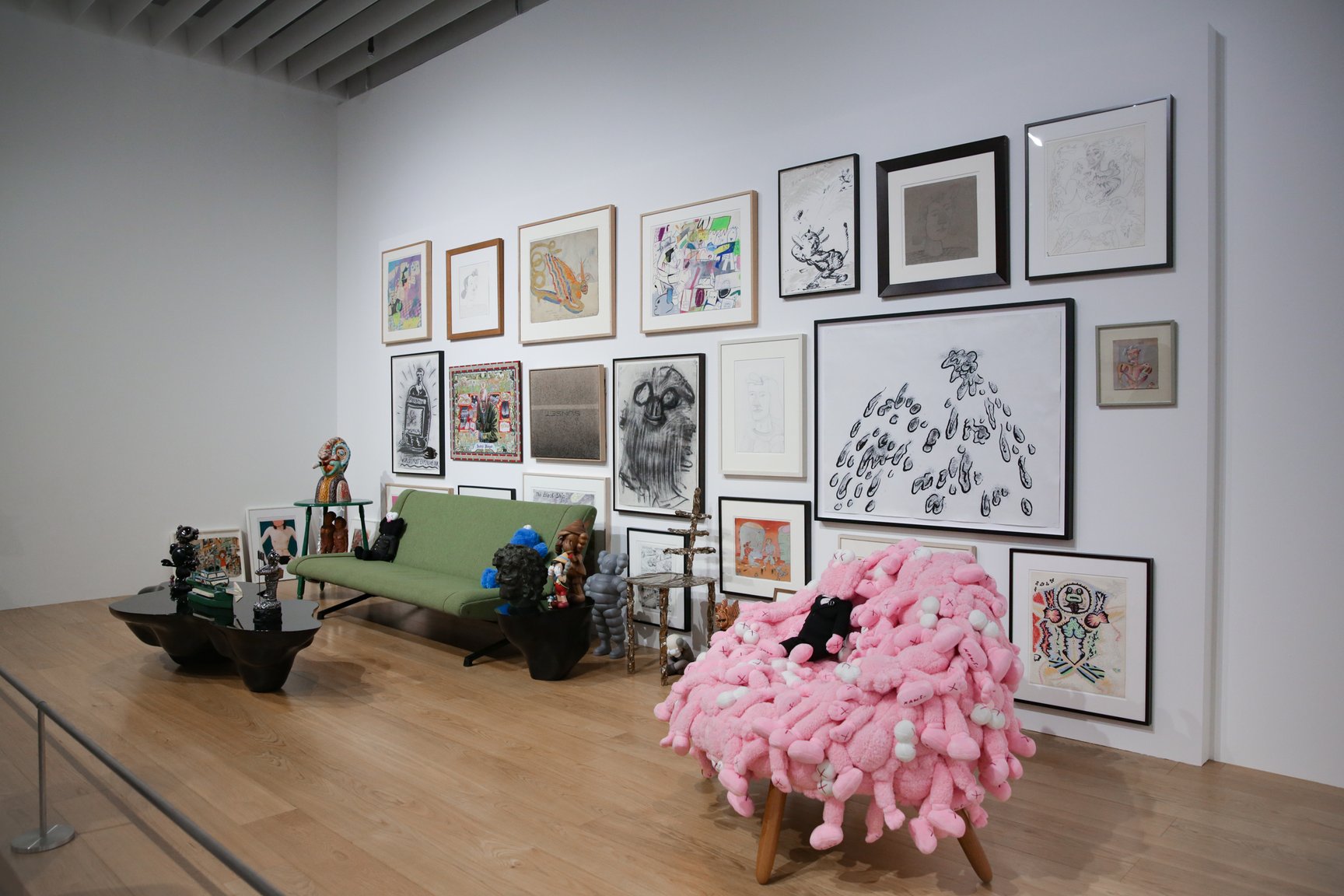 会場ではコンパニオンやキンプソンなどKAWSを代表する約70点の絵画をはじめ、彫刻、プロダクト、ARアート、同氏が影響を受けた他アーティストのプライベートコレクションなど約150点を展示。KAWSは「大規模な展覧会の意味合いとしては一つのところに焦点を当てるのではなく、私の全体のストーリーを共有することができることだと思います」と話す。プライベートコレクションの展示ではKAWS自身のスタジオを再現。パーソナルなスペースを共有することで、KAWSの興味の変遷を感じとれる空間に仕上げた。
