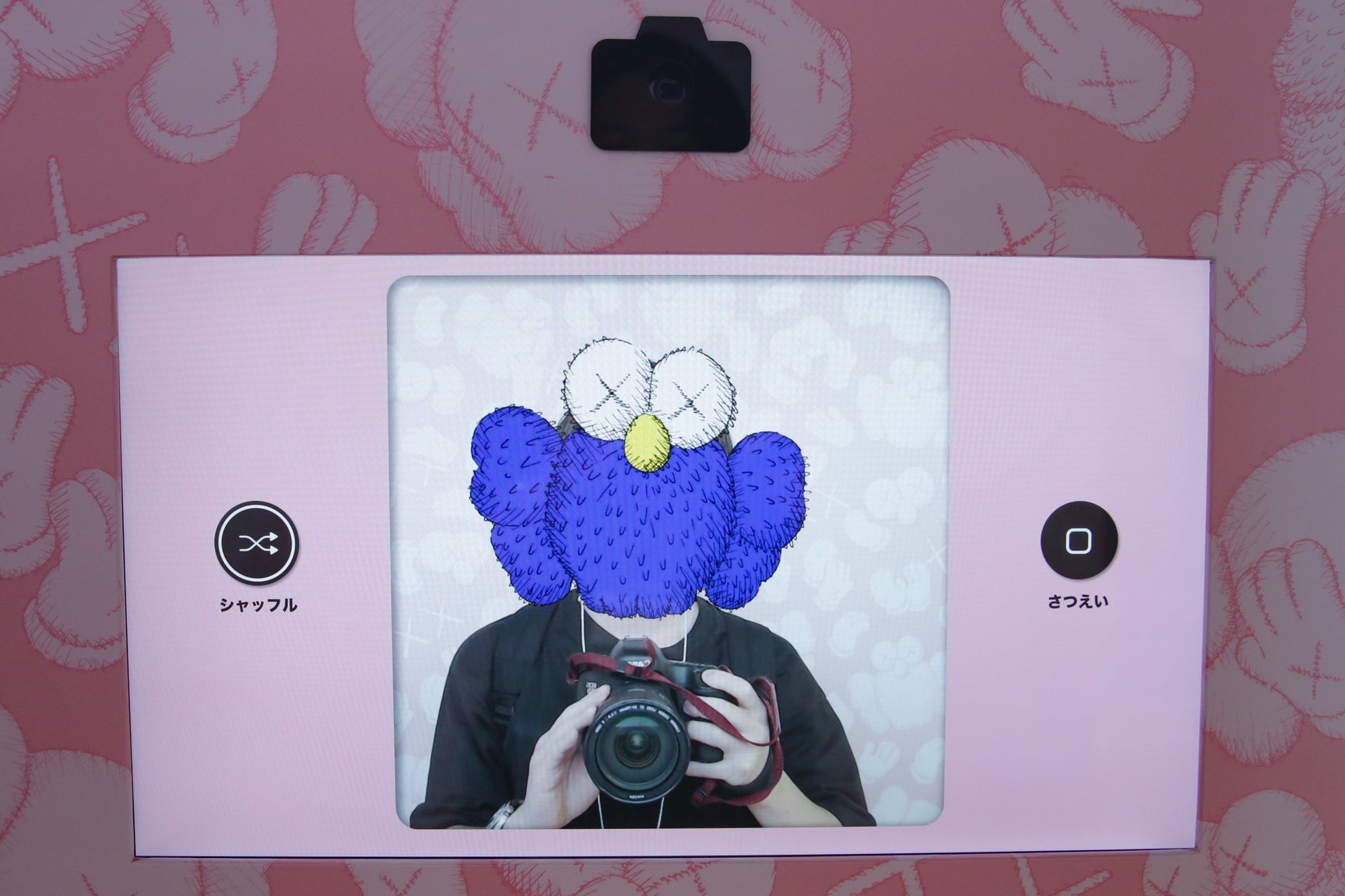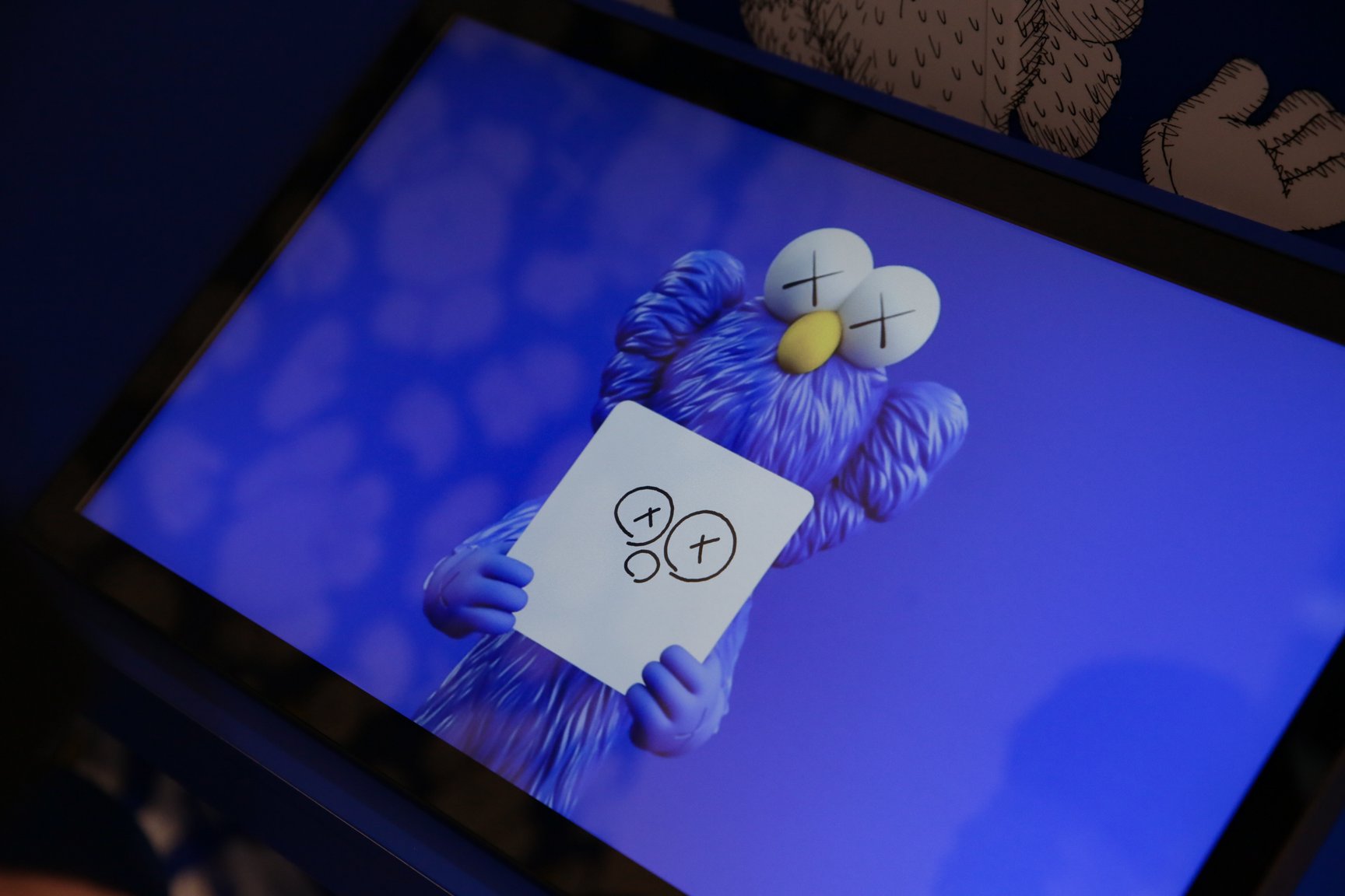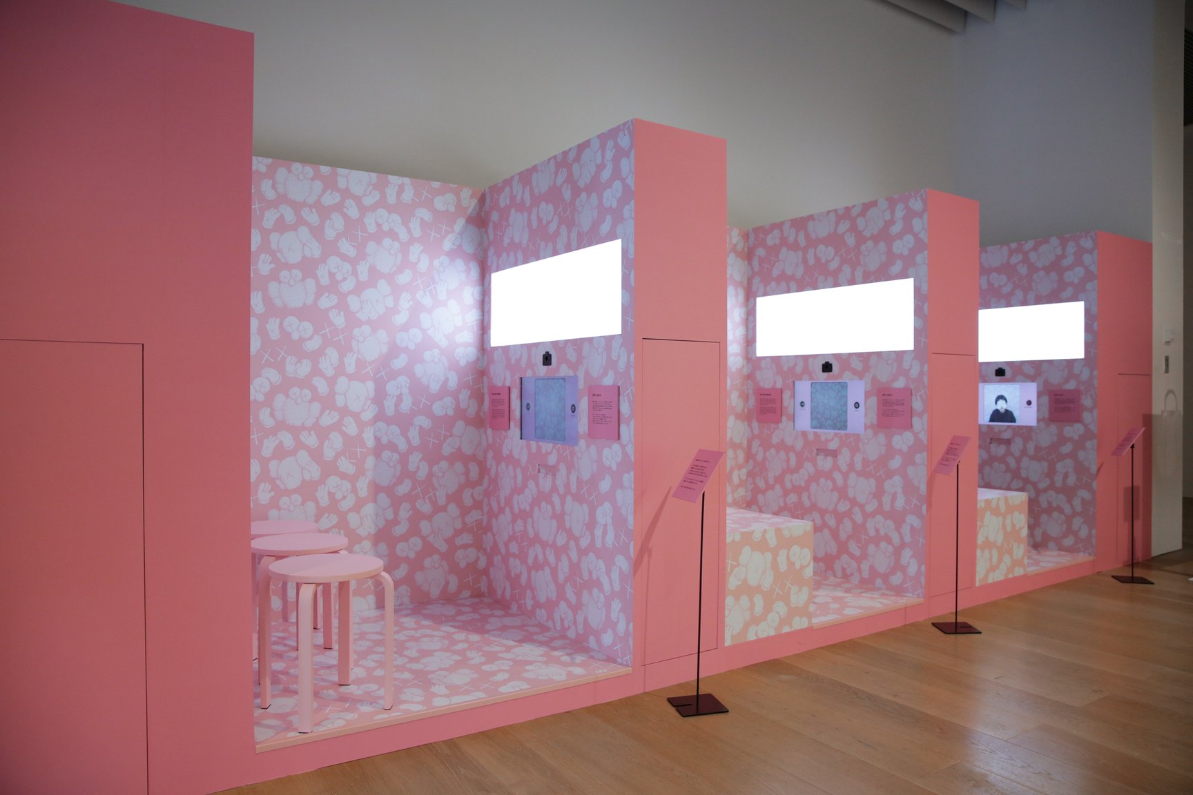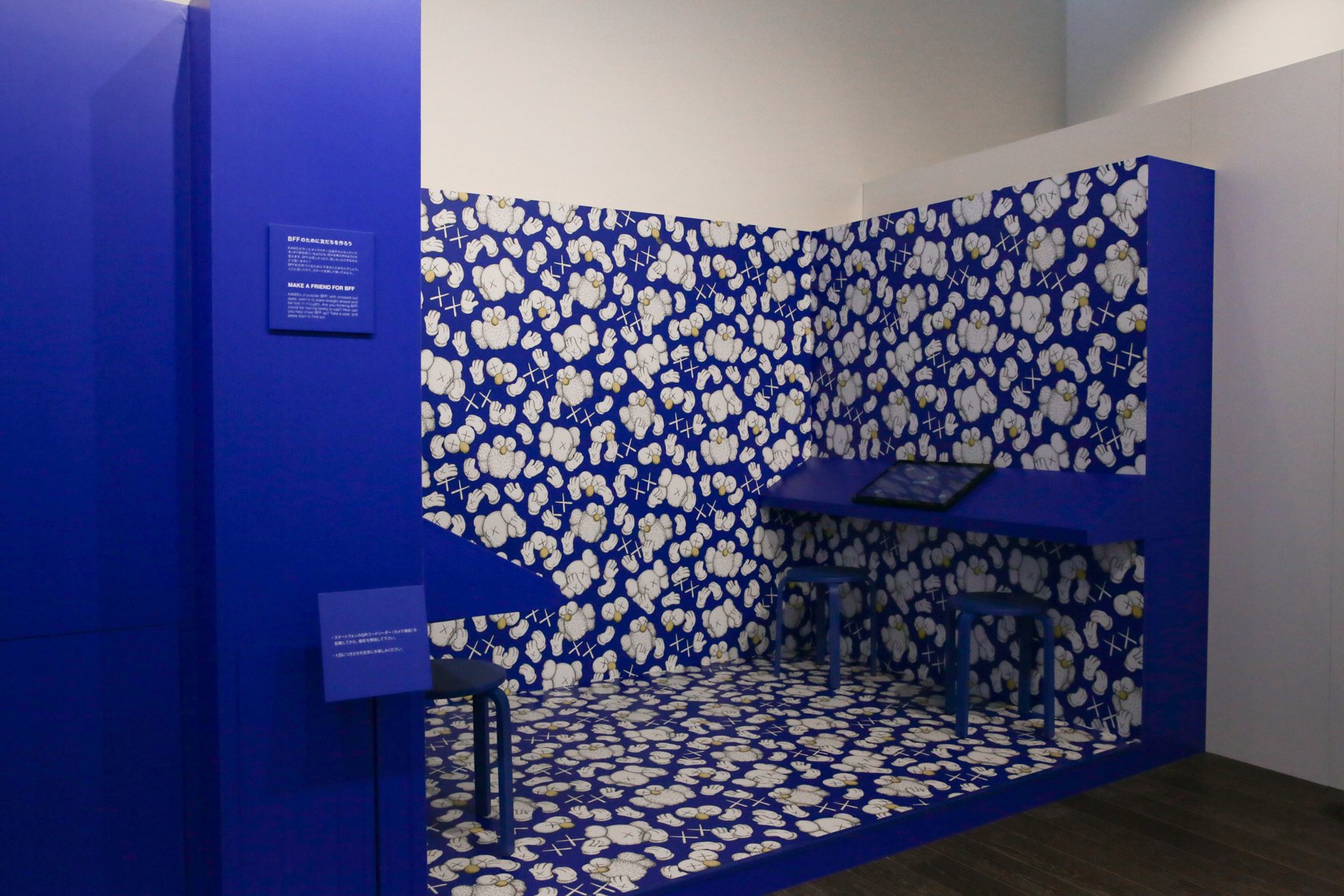 同展の会期は2021年7月16日から10月11日まで。会場の出口には「KAWS:PLAYTIME」と題されたインタラクティブ展示を設置。来場者が描いたイラストとKAWSの代表的なキャラクターBFFの写真が撮れる「Make a Friend for BFF」と、自身の顔にBFFの体の一部を写して動画が撮影できる「BFF and Friends」を用意した。物販エリアでは、「ユニクロ(UNIQLO)」のTシャツブランド「UT」とのコラボレーションコレクションをはじめ、トートバッグ(7万7000円)、ポーチ(2万4200円)、財布(2万2000円)を展開する「ポーター(PORTER)」とのコラボアイテムや、「サカイ(sacai)」とのコラボバッグ(1万3200円)、目を「××」にアレンジした名菓ひよこ(2160円)、スケートボード(8470円)、テープ(1100円)などを販売する。