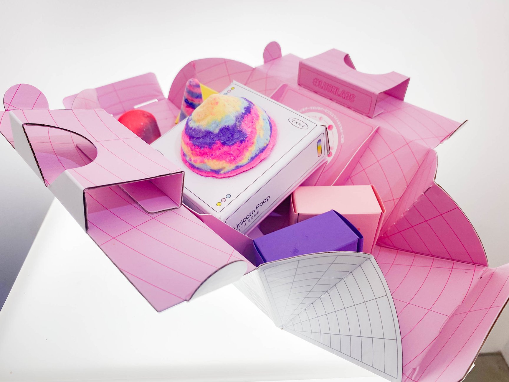 原宿店のリニューアルから3年が経った今年、オンラインとオフラインの新たな実践として、アプリ限定商品の発売と、商品に連動したポップアップを実施。第1弾の「ユニコーンフ?ーフ? ホ?ックス」(5000円)は、カラフルでドーリーミーなデザインで、レインボーのわたあめやユニコーンモチーフなど、ジャック氏が原宿で体感した物事に着想して開発した。ボックスはバスボム、バブルバー、ソープ、グリッター3色をセットにし、NFTアートを入手できるQRコードが付属する。