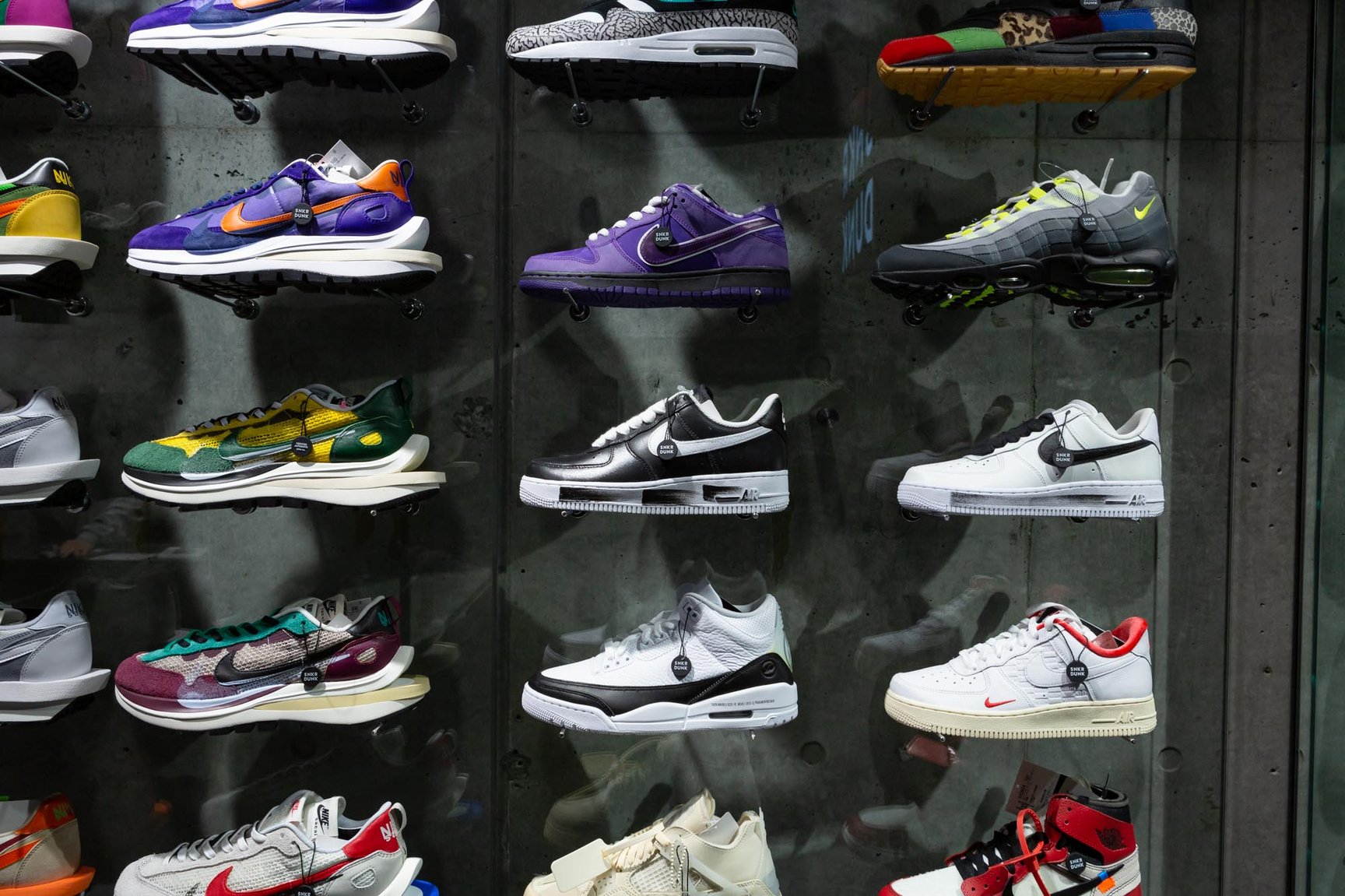店舗は、「シュプリーム(Supreme)」や「ハフ(HUF)」「カーハート WIP(Carhartt WIP)」などが店を構えるプロペラ通り沿いに位置。建物は2階建てで、1階が販売エリア、2階が商品持ち込みエリアとして営業する。昨今のスニーカー史上では商品の実物を見ることなく購入する機会が増えているが、購入後に「イメージと違った」という顧客の声が多かったことから、販売エリアには正規販売で完売している人気スニーカーをスニーカーダンクが初めて在庫を抱える形で展開。オープン当初は「ナイキ(NIKE)」のモデルを中心に、シュプリームとのエア フォース 1や、「サカイ(sacai)」との「LD ワッフル」「ヴェイパーワッフル」、人気モデルのダンクやエア ジョーダン 1など300足を販売する。