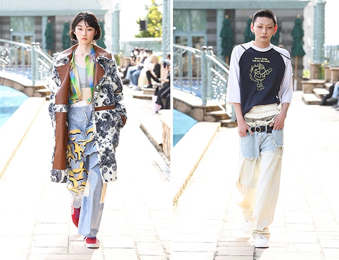 アイテムの中には、高校生時代につくった長襦袢や手書きのシャツもミックスされていたが、どれも2022年でも自然とハマっていたのは、スタイリスト?小山田孝司の力がある。彼もコトハと同じく、1990-2000年代の東京のストリートファッションを体験してきてるからこそ、おそらくショーまで言葉少なくファッションを通してふたりの会話は弾んでいったのだと思う。彼らが今までファッションをとおして人と心を通わせてきた体験は、ローライズを「腰パン」にさせ、そこから覗くパンツには油性ペンで書かれた名前が見え、当時流行ったベロを折ったユーズドコンバースが近日オフィシャルコラボレーションする新作シューズとともに登場した。