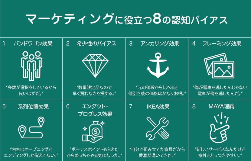 マーケティングに役立つ認知バイアスとして8つの効果や法則と、実際にマーケティングの現場での活かし方のアイディアをご紹介した。