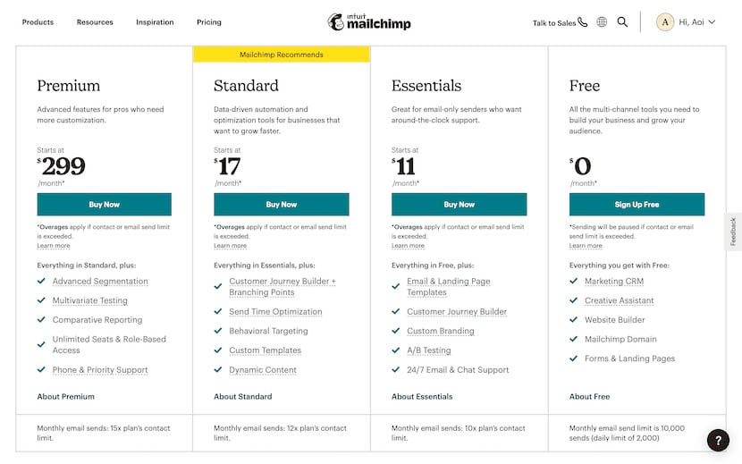 メールマーケティングサービスMailChimpのプラン&料金ページ
