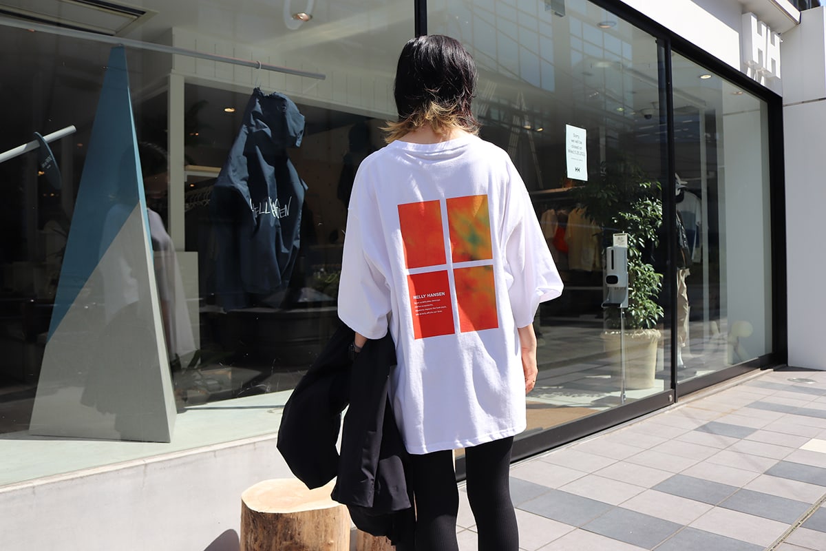 「海洋の水質汚染をリトマス紙を使って可視化した、岡本光市氏によるアートプリントTシャツです。水や海と関わりが深いヘリーハンセンが、地球の水資源と向き合う取り組み『H2O PROJECT』のもの。ドロップショルダーのオーバーサイズシルエットでざっくりとチュニックのように着られるので動きやすい1枚です。ボディは海洋プラスチックごみを原料としてリサイクルされたポリエステル『GREEN MATERIAL』を採用しています。」