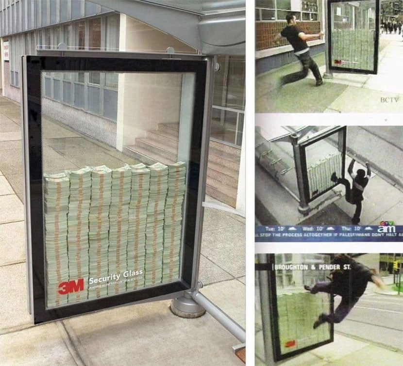 バンクーバーのバス停で透明のケースに300万ドル。どうにかして割ることができれば現金がもらえる。これは3Mの強化ガラス (スコッチシールド) の強さを示すキャンペーン。ルールは道具を使わないこと。挑戦者の様子を映すカメラも設置された。