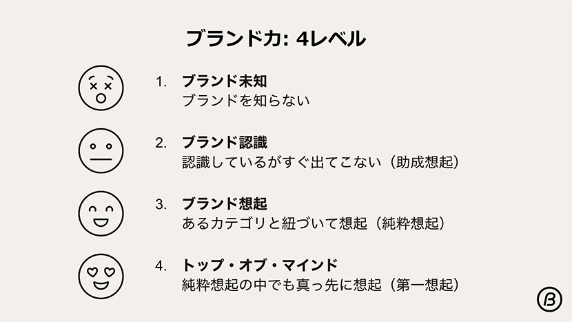 ここで基本となるブランド力の4レベルを見てみよう。下記のようにブランド力の強さによって4つのレベルに分けられる。誰も知らないLevel 1だと、営業をするにもマーケティングを行うにしてもかなりしんどい。言い換えるとコストがめっちゃ高くなる。