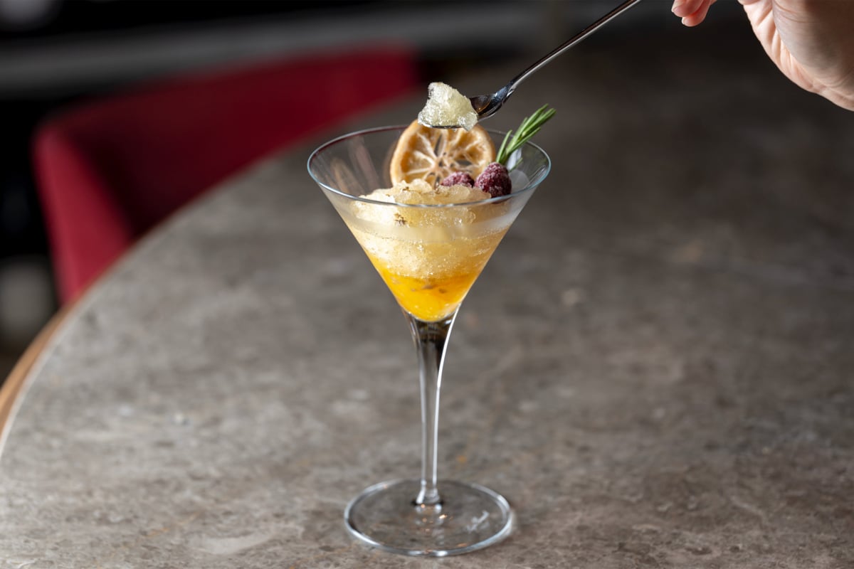 世界三大貴腐ワインのひとつである、ソーテルヌの「グラニテ」。そのグラニテにマーマレードとカルダモンを合わせました。一緒に味わうと華やかで香り高い一品。添えられたローズマリー、ドライレモン、フローズンラズベリーが涼やかさを演出します。溶けていくグラニテと各食材のマリアージュをカクテル感覚でも楽しめる。