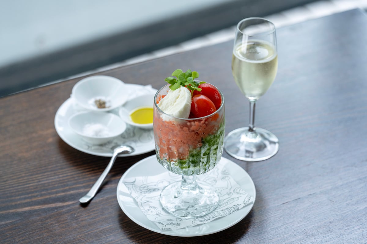 イタリアの前菜「カプレーゼ」を、甘さと酸味のバランスがとれたフルーツトマトとレモンを効かせた甘いバジルの「グラニータ」で表現。イタリア産水牛のモッツァレラ、ミニバジルを添えて。また、一緒に提供されるスパークリングワインをかけるとより爽快感が際立つ。味と食感の変化に驚く一品。