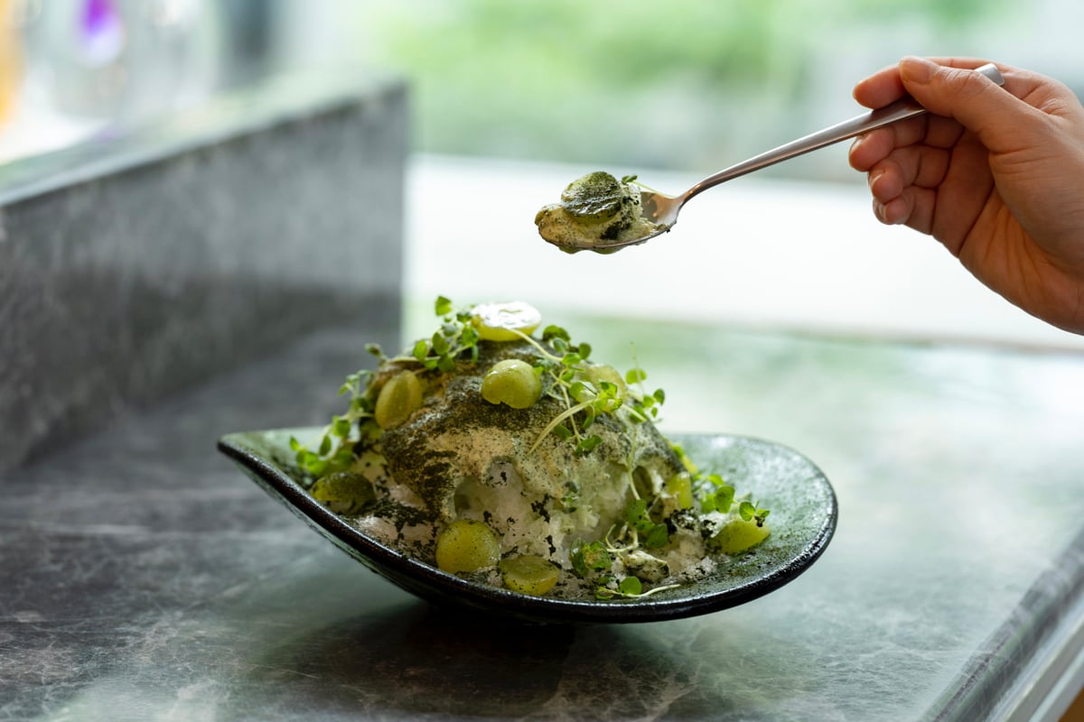 パリッとジューシーなシャインマスカットと白ぶどうのシロップで瑞々しい甘さが特徴。さらに上から大葉のムースとパウダーをたっぷりと乗せ、爽やかさが際立つ。氷の中に隠されたゴルゴンゾーラチーズのムースが、さっぱりとしたかき氷を濃厚な味わいへと変化させる。