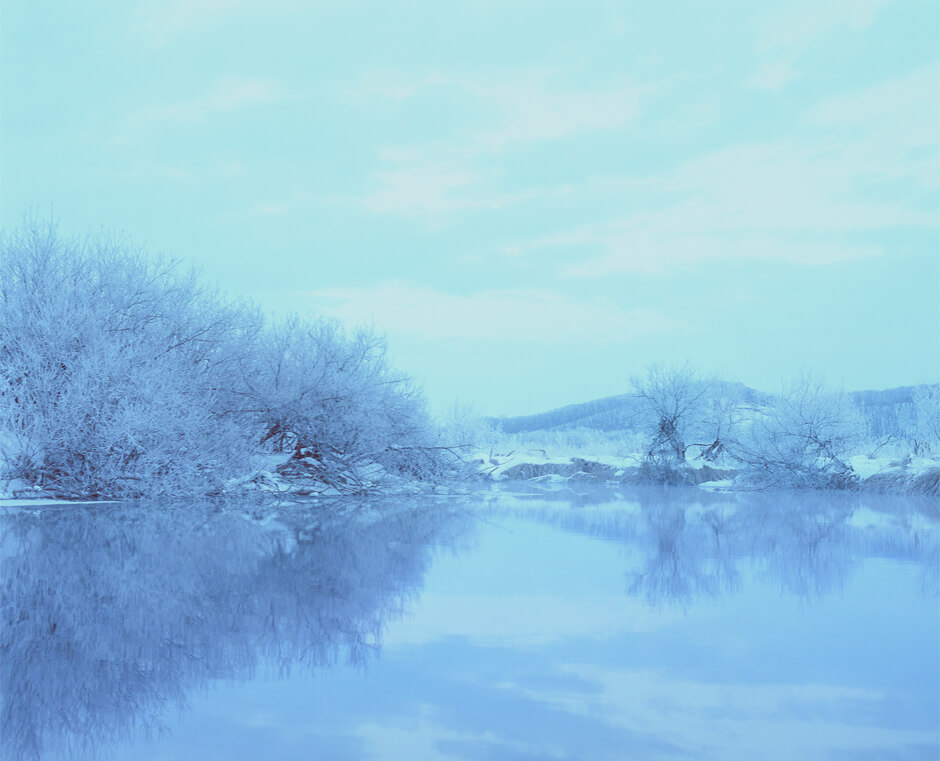 冷たく、ひたすらに澄んだ空気が満たす圧巻の雪景色が、湖面や空のブルーと静かに呼応する。