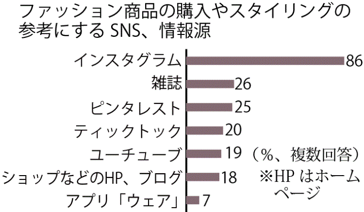 4位は「ティックトック」、わずかの差で5位は「ユーチューブ」で、ほぼ5人に1人が動画もよく見ると回答。6位「店舗やブランドのホームページやブログ」は18%で、昨年までの参考にする媒体?情報源の問いでは3割前後いた利用者が減少。7位のコーディネートアプリ「ウェア」は7%の回答にとどまった。