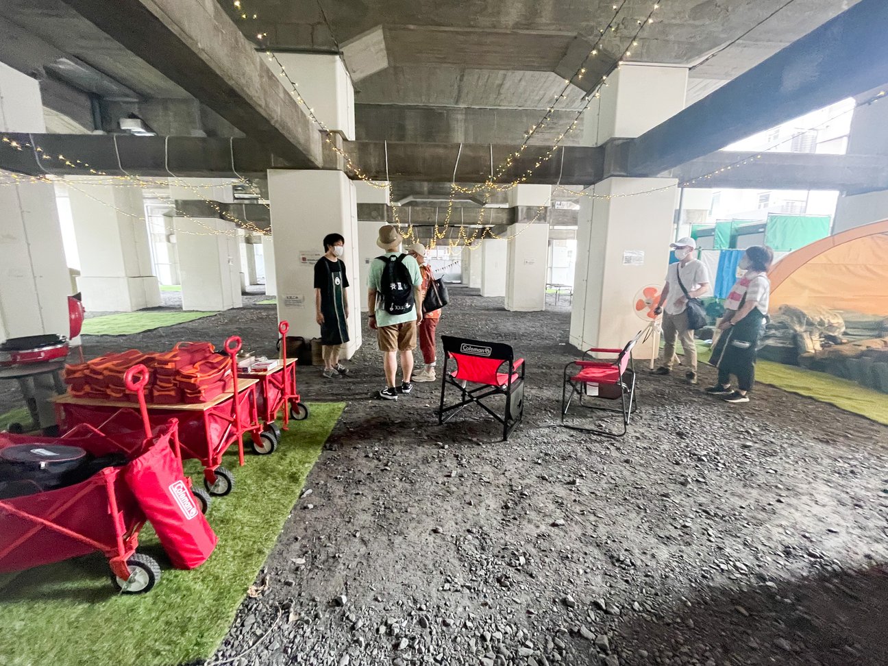 高架下キャンプ練習場は、新規事業提案社内コンペで事業化検証に選ばれた企画。郊外に位置するキャンプサイトはアクセスがしづらかったり、キャンプ道具においては揃えるだけではなく自身で設営する必要があるなど、初心者にとってハードルの高いイメージがあるキャンプを、あらかじめ用意されたキャンプ道具を使って「練習」できる場を提案する。