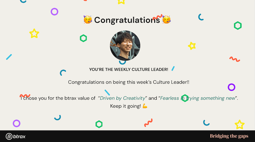 その際に、司会進行を務めるスタッフが、btraxのカルチャーバリューに沿った行動をしていると感じたスタッフを選出して、その理由とともに表彰しています。