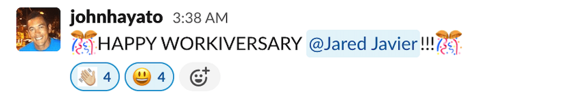 勤続年数が更新される時にはSlackでお祝いのメッセージが!自分でもなかなか気がつかないからこそ、他のスタッフに言われるとより一層嬉しいもの。