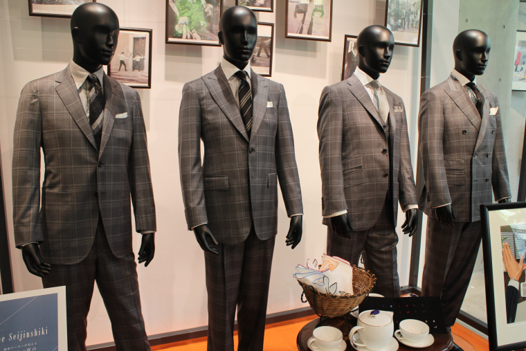 グレンチェックや千鳥格子など同じ色柄の生地を選んでも、シングルやダブル、スリーピースなどデザインを変えることで、一体感はありつつも個々人の個性も表現できる。若い世代にとっては〝インスタ映え?の効果も大きい。スーツは税込み4万4000円から。