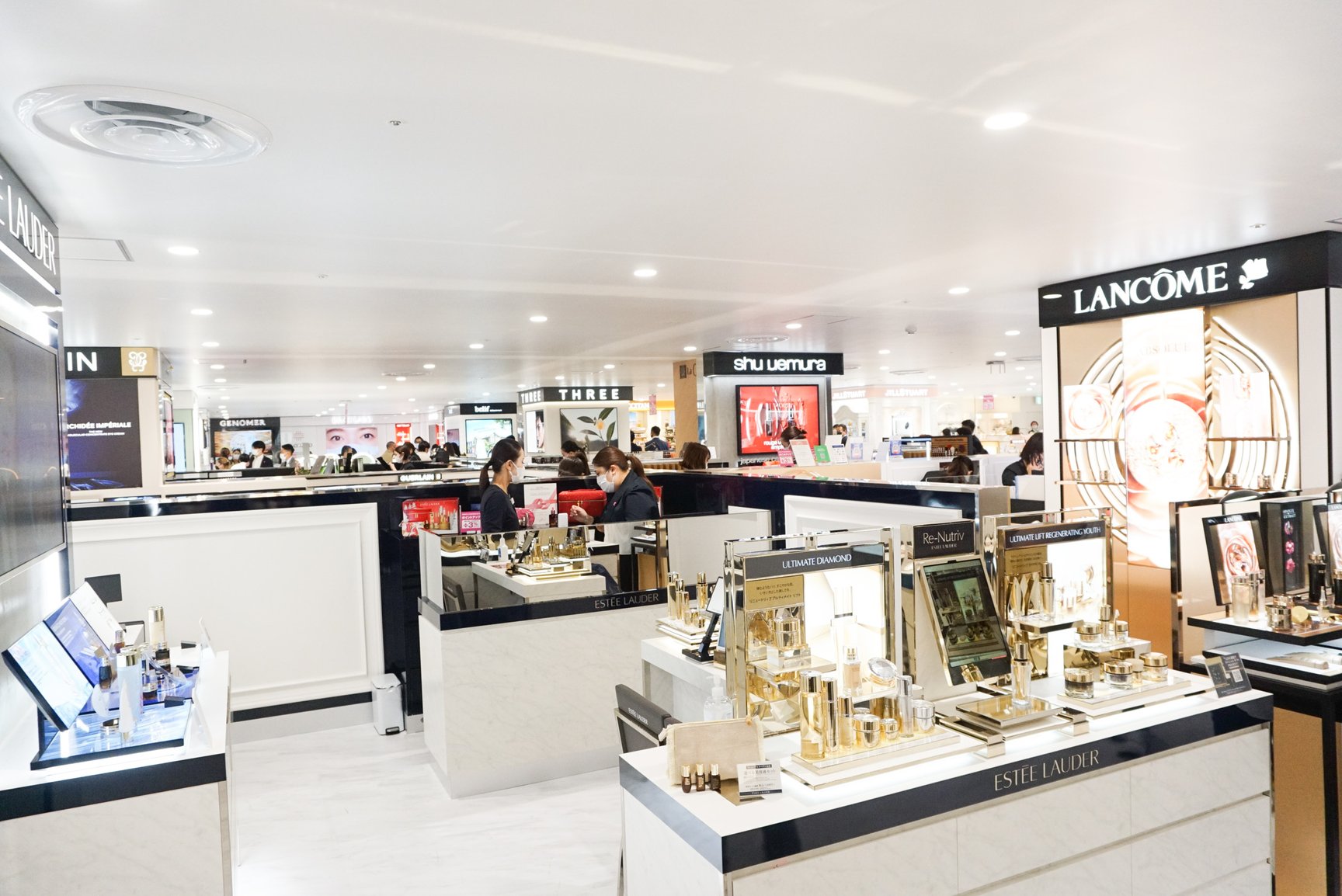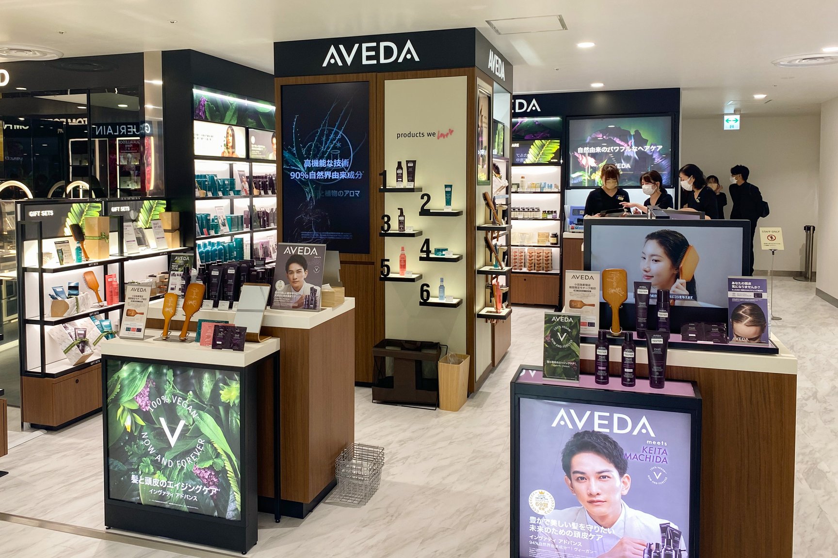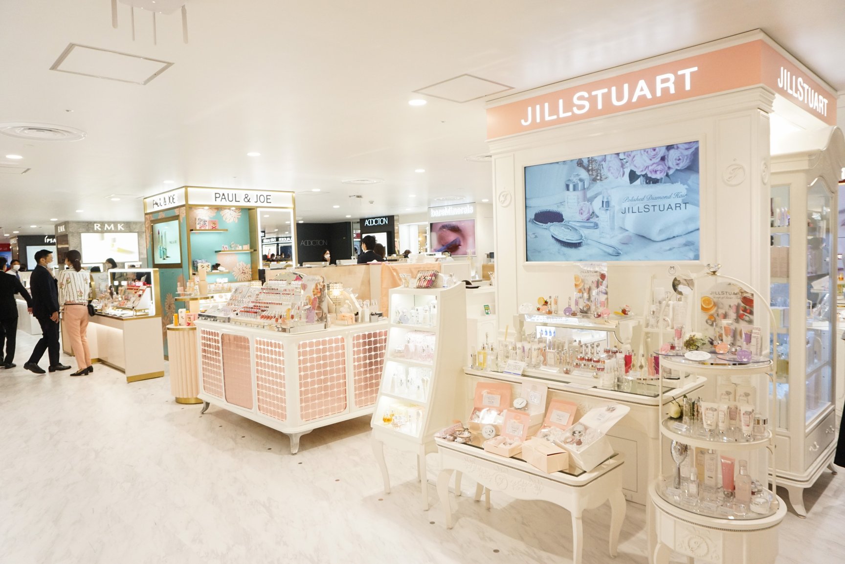化粧品は本館の9割の広さを確保し、ほぼ同じブランド数を確保。51ブランドで46ショップを展開する。新規で「ジョー マローン ロンドン(JO MALONE LONDON)」「アヴェダ(AVEDA)」のほか、韓国コスメ「ビリーフ(belif)」「シーエヌピーラボラトリー(CNP Laboratory)」の国内初の常設店を開設した。また、川辺が展開するフレグランスのセレクト売り場をリニューアルしたほか、ヘアケアにも注力しジェンダーレスな提案を強める。サービス面では非接触肌診断をはじめとしたウィズコロナに対応するサービスを導入。このほか、一部のショップには卵の殻から生まれた壁紙やリサイクル材の化粧板など環境に配慮した素材を使用している。