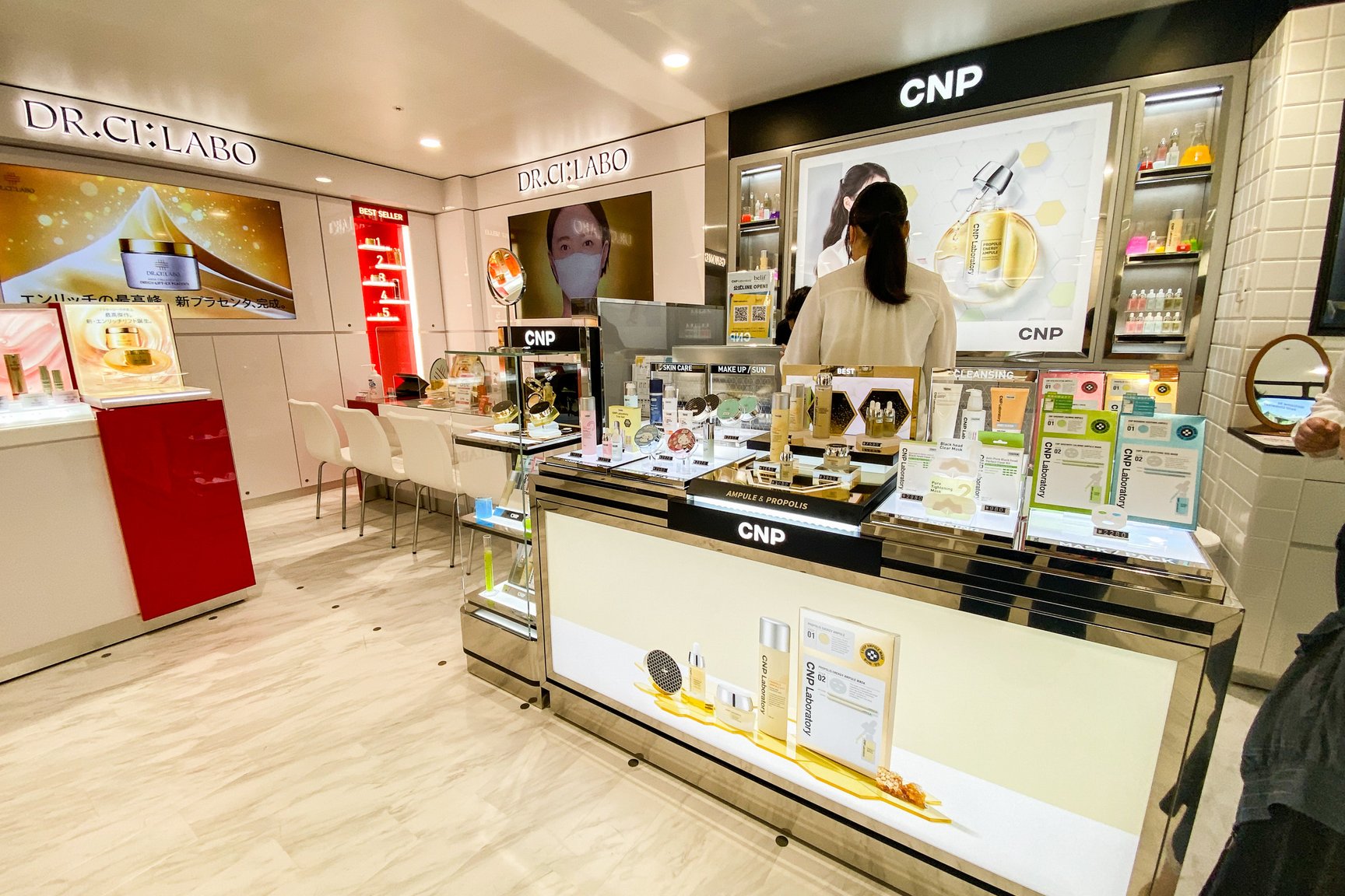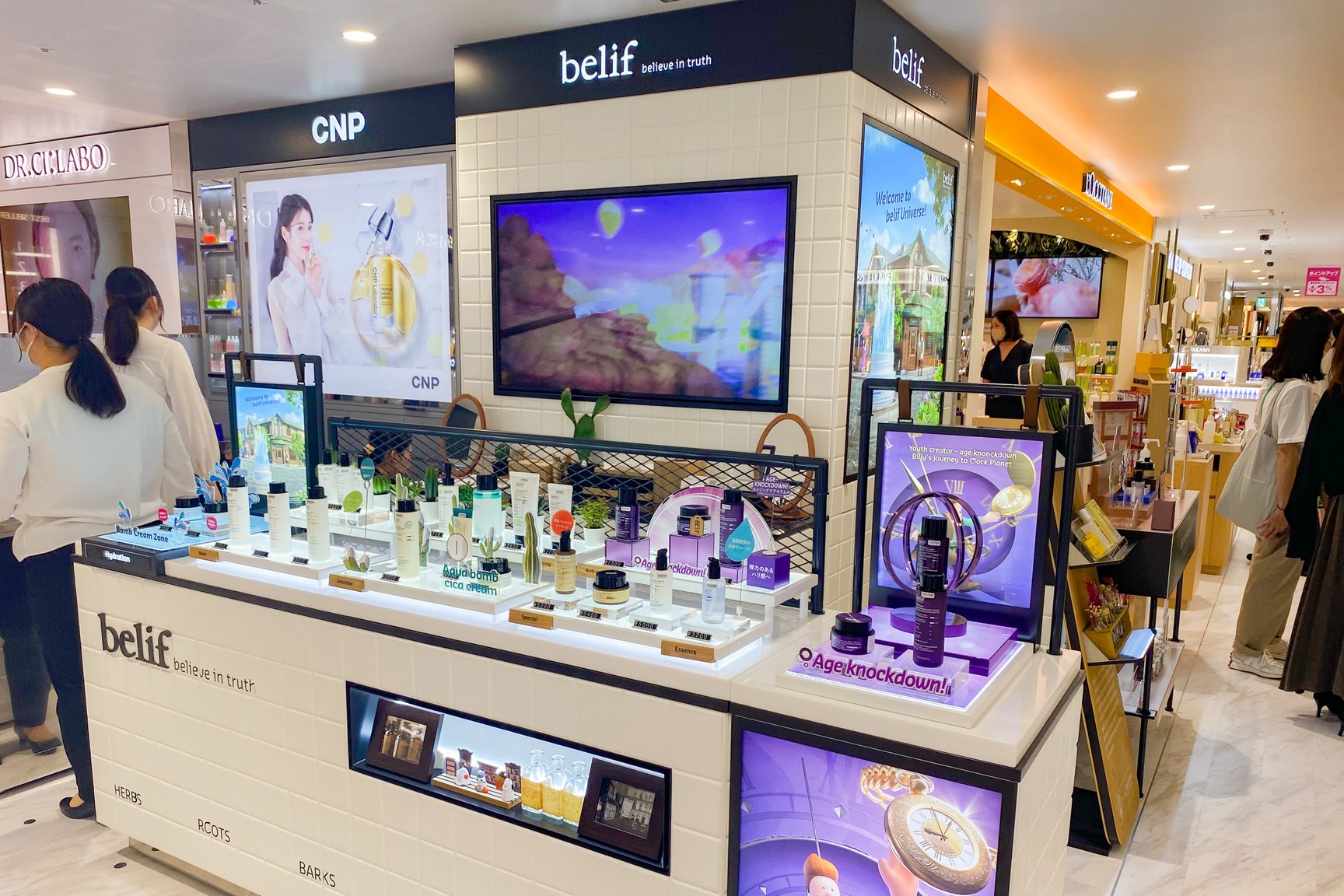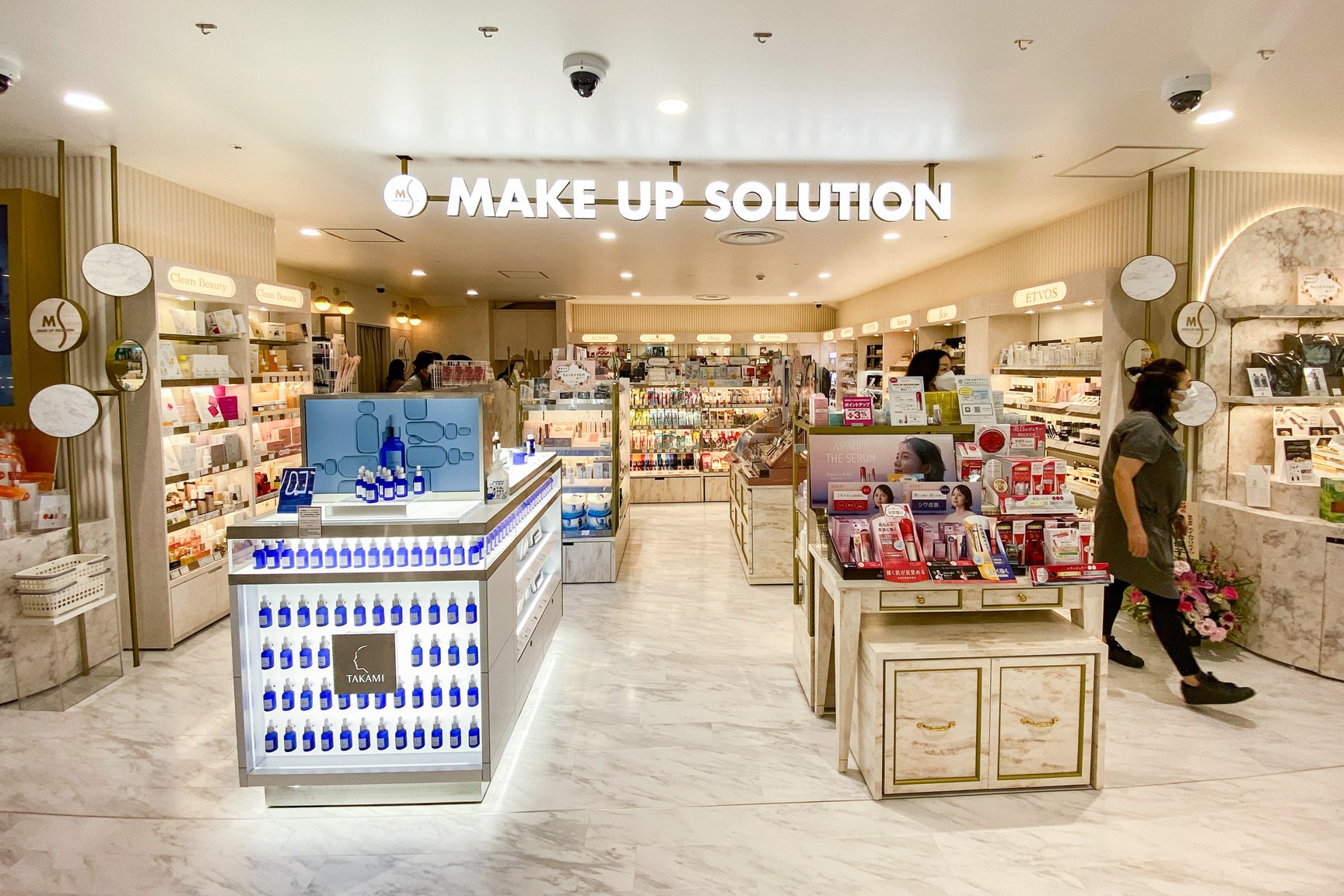 化粧品は本館の9割の広さを確保し、ほぼ同じブランド数を確保。51ブランドで46ショップを展開する。新規で「ジョー マローン ロンドン(JO MALONE LONDON)」「アヴェダ(AVEDA)」のほか、韓国コスメ「ビリーフ(belif)」「シーエヌピーラボラトリー(CNP Laboratory)」の国内初の常設店を開設した。また、川辺が展開するフレグランスのセレクト売り場をリニューアルしたほか、ヘアケアにも注力しジェンダーレスな提案を強める。サービス面では非接触肌診断をはじめとしたウィズコロナに対応するサービスを導入。このほか、一部のショップには卵の殻から生まれた壁紙やリサイクル材の化粧板など環境に配慮した素材を使用している。