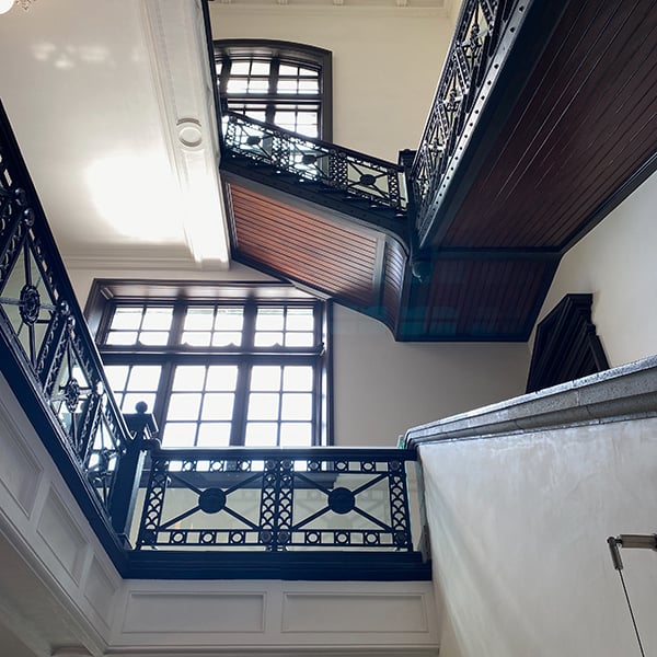 客室フロアは宿泊者のみしか入れませんが、ぜひ見てほしいのが階段の景色。芸術的な螺旋階段を下から見上げると、ちょうど上にきれいなステンドガラスが見えるんです!