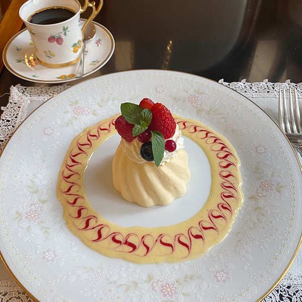 デザートの中で特に人気が高いのは、こちらの「伝統のババロア」(税込1400円)。芸術的なお皿の装飾や、ババロアのまわりを彩るソースの美しさに、うっとりしちゃうこと間違いなしですよ。