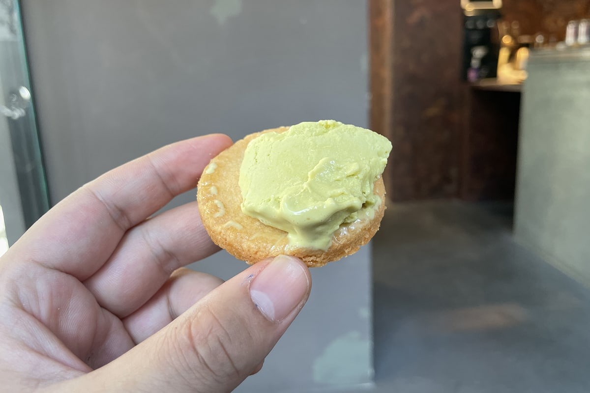 カフェラテを飲みながら、少しアイスが溶けるのを待つ。ほどよく柔らかくなったアイスを、スプーンですくってクッキーにたっぷり乗せる食べ方がオススメだ!これなら手もベタベタせず綺麗においしく食べられる。バターが香ばしいクッキーと、ピスタチオ独特の濃厚な味わいが相性抜群。