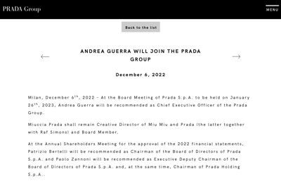 プラダグループは、12月6日にグループ全体の人事を発表。2023年1月に行われる取締役会をもって、イタリアの大手アイウェアメーカー「ルックスオティカ(Luxottica)」前会長 アンドレア?グエラ(Andrea Guerra)氏が新たな最高経営責任者に就任し、ミウッチャ?プラダ(Miuccia Prada)氏とパトリツィオ?ベルテッリ(Patrizio Bertelli)氏は共同CEOを退任する。今後はダッティ氏とグエラ氏の経験を活かした戦略で、ブランドのグローバル規模での成長を促す方針だという。