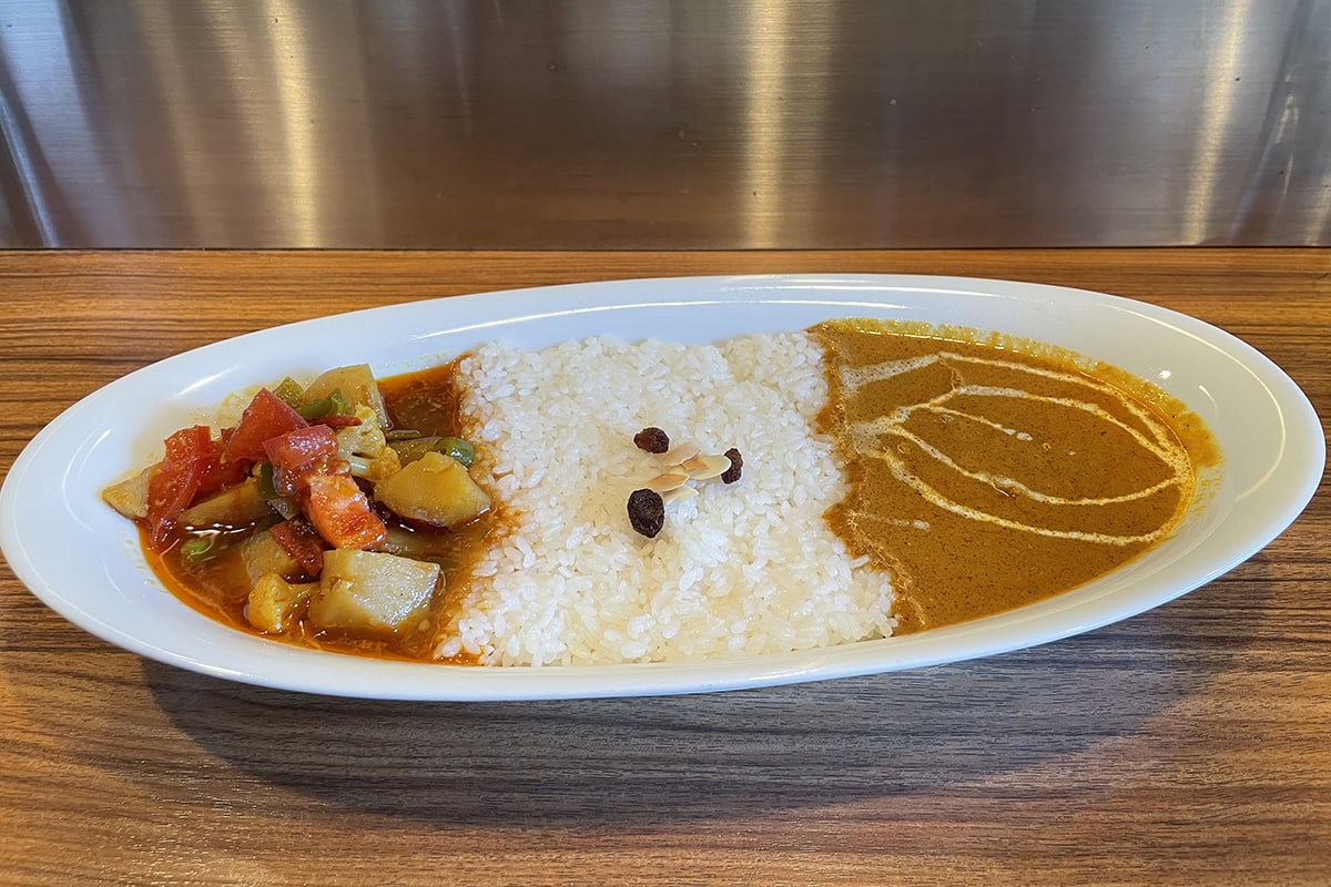 店内には、スパイシーないい香りが立ち込めている。名物は、左右に異なるカレーを組み合わせてオーダーできるコンビネーションカレー。ビーフやキーマなど、さまざまなカレーがラインナップされている。どれにするか迷ったが、今回はバターチキンカレーとやさいカレーをチョイス。さっそくいただきます!