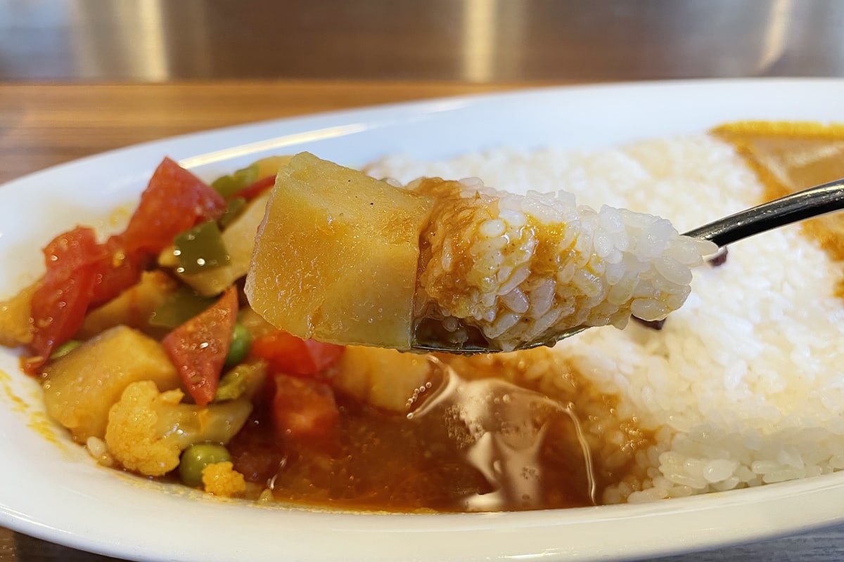 「CURRY UP?」のカレーは、TシャツのようにサイズがS?M?Lと展開されていて選べるのも嬉しい。バターチキンカレーは、濃厚なコクとトマトの酸味、バターのまろやかな風味が口の中に広がり、「コレだよコレ!」となるおいしさだ。ゴロゴロ野菜がたっぷり入ったやさいカレーも、食べ応えがあって絶品。お米は程よく固めに炊き上げられているためカレーと絡めて食べても、お米の粒感がしっかりと味わえてかなり好み。