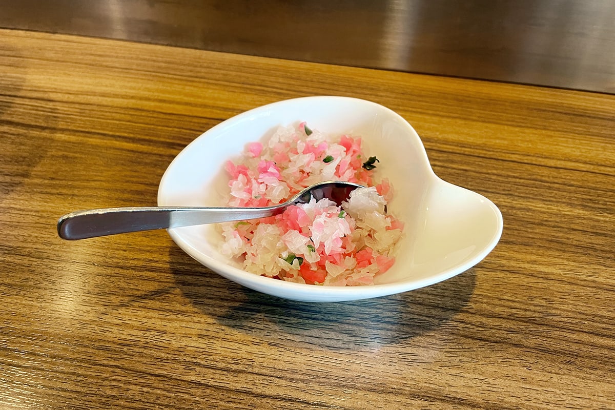 カラフルでポップな薬味も「CURRY UP?」の魅力。らっきょう、桜大根、青じそを細かく刻んだものだが、「CURRY UP?」でしか見ることのない色彩だ。NIGO?さんらしい、ポップなカラーセンスをこういった細かいところに見て取れるのも楽しい。さっぱりとしていて、ほのかな甘さがやみつきになる。カレーとの相性はいうまでもなく最高!できるならタッパーに入れて持って帰りたいくらいおいしいのだ。