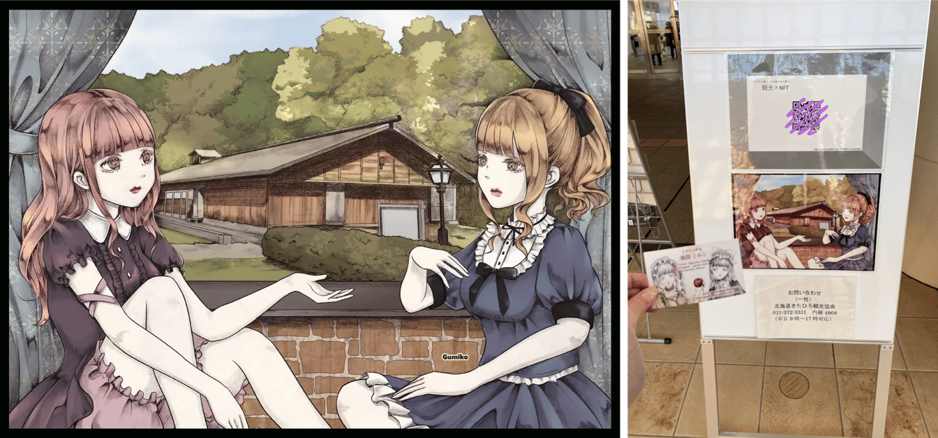 (左)NFTイラストレーター?鹿間ぐみこ描き下ろしイラストNFT「団欒トラベルノート北広島市~旧島松駅逓所?」(右)北広島市の駅ホームに設置したQRコード