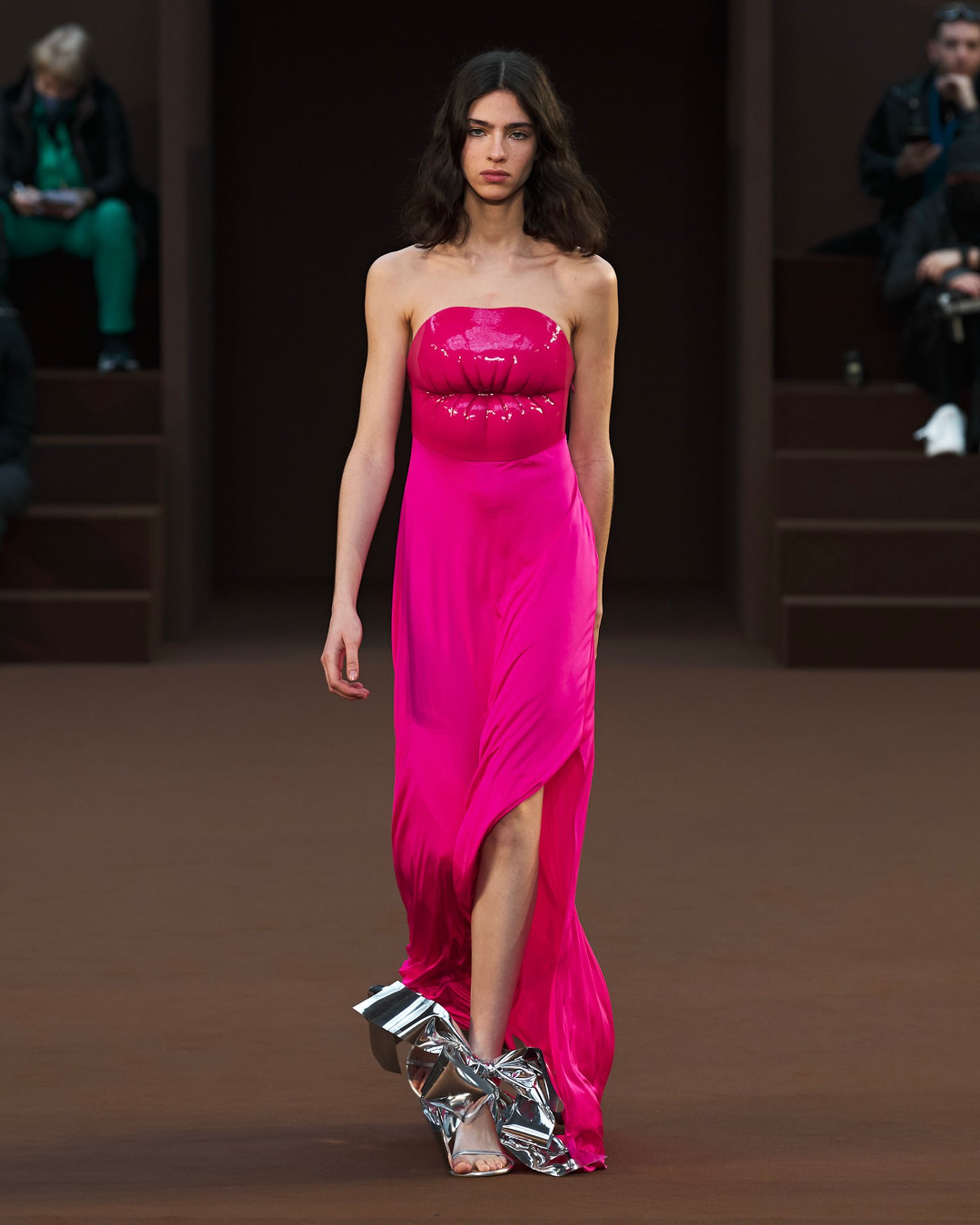 ショー会場のセットを含め、鮮やかなフューシャピンク一色に染め上げたのは「ヴァレンティノ(VALENTINO)」の「ピンク PP コレクション」。ミニマルなテーラリングのセットアップから華やかな装飾を施したドレスまで、ワントーンに統一することで素材やテクスチャーの個性が際立った。一点取り入れるだけでも、色からポジティブなパワーをチャージできそう。