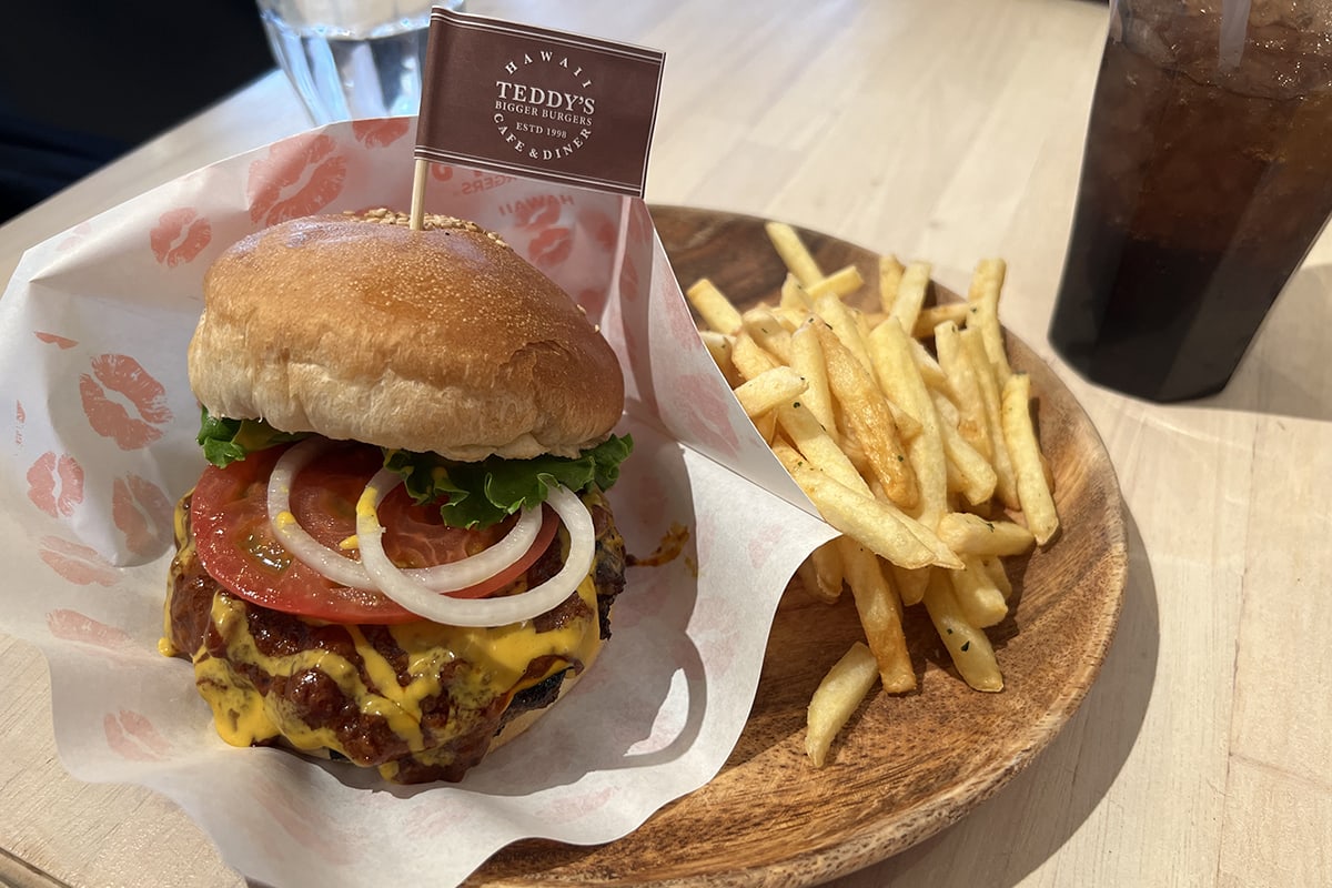 明治神宮前駅の7番出口から出て、右手に明治通り沿いを進んでいくと、古着屋JAMの2FにTEDDY'S BIGGER BURGERSはある。ハワイで22年連続(!)ベストバーガーに選出されるハワイ生まれのハンバーガーチェーンだ。世界規模で展開されているが、東京は意外にも原宿のみ。ほかの国内店舗は神奈川、千葉、宮崎、沖縄など海がある県に出店している。海と相性が良いハワイ生まれのバーガーショップらしさと言えるかも。